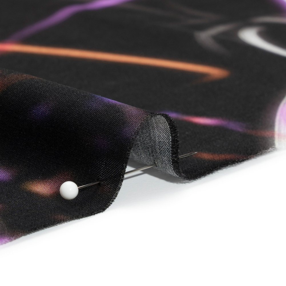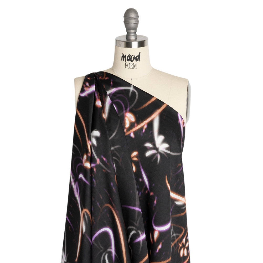 Electrify your next sewing project with this Mood Exclusive Orange Shutter Speed Racer Viscose and Recycled Polyester Satin! Like a camera capturing a fireworks display through a long exposure, trails of neon purple, orange, and white lights bolt through a black sky.