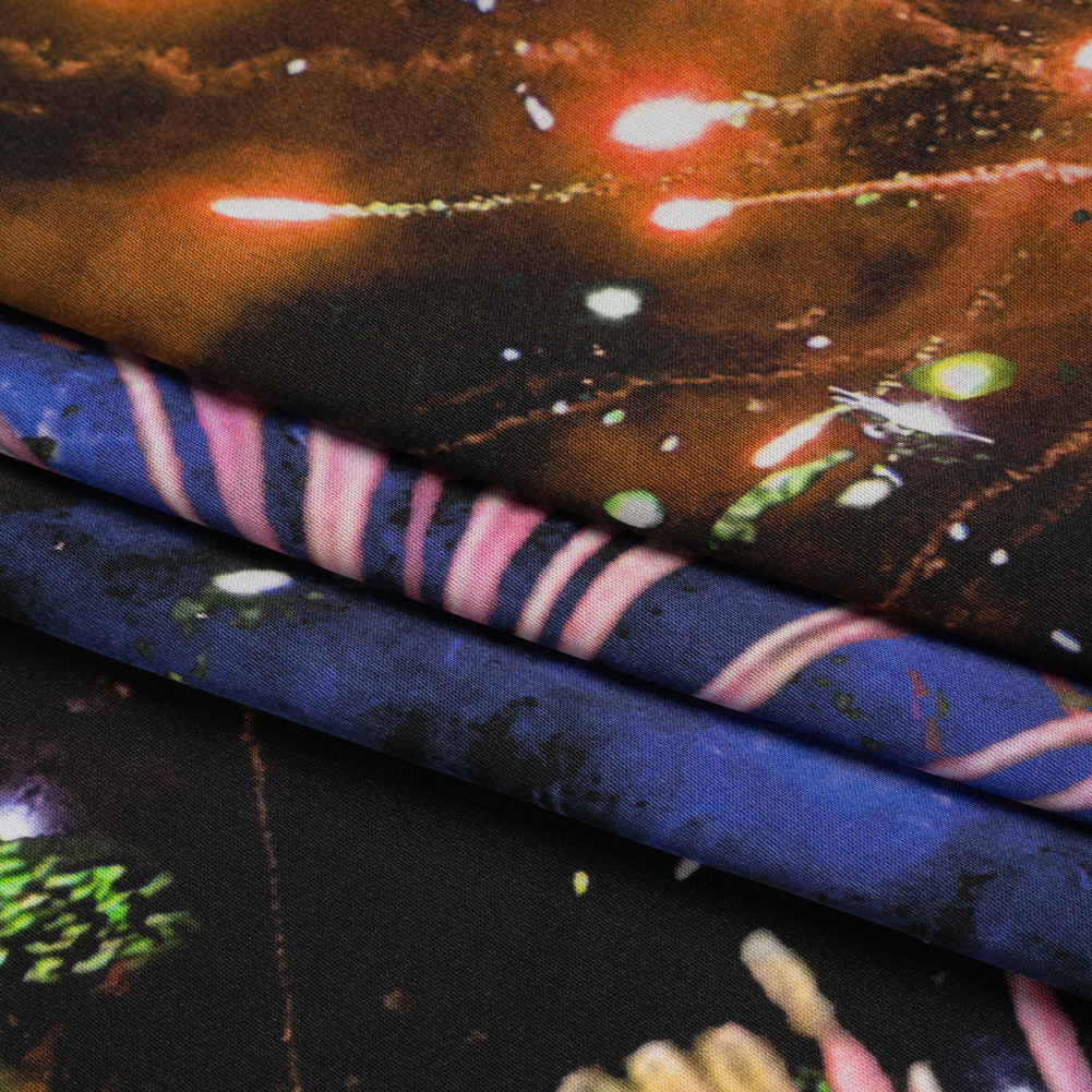 Our Mood Exclusive Pink Mirrored in Nature Sustainable Viscose and Recycled Polyester Satin highlights the similarities between a firework finale and flowers. Man-made blue, green, and orange fireworks mimic pink and orange flowers under a black sky. This eco-friendly fabric boasts a subtle sheen, silky-smooth face, and a lightweight drape. Perfect for all seasons and occasions, imagine button-downs and maxi skirts in fall or airy dresses and handkerchief shirts in summer! Translucent; a lining is recommended.