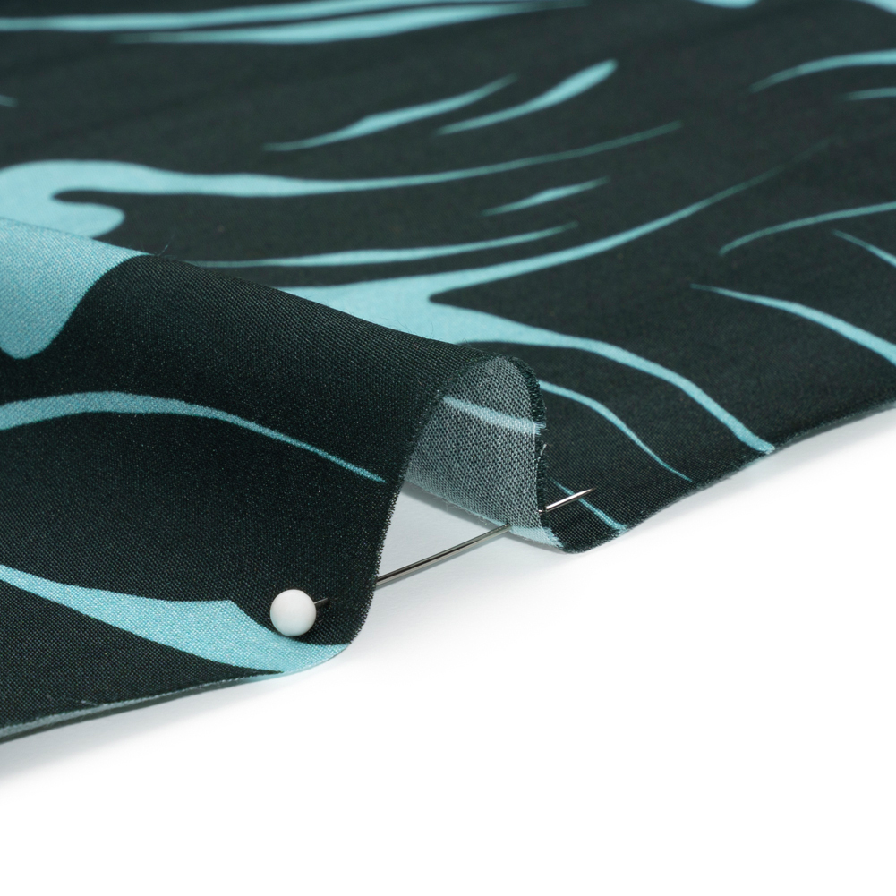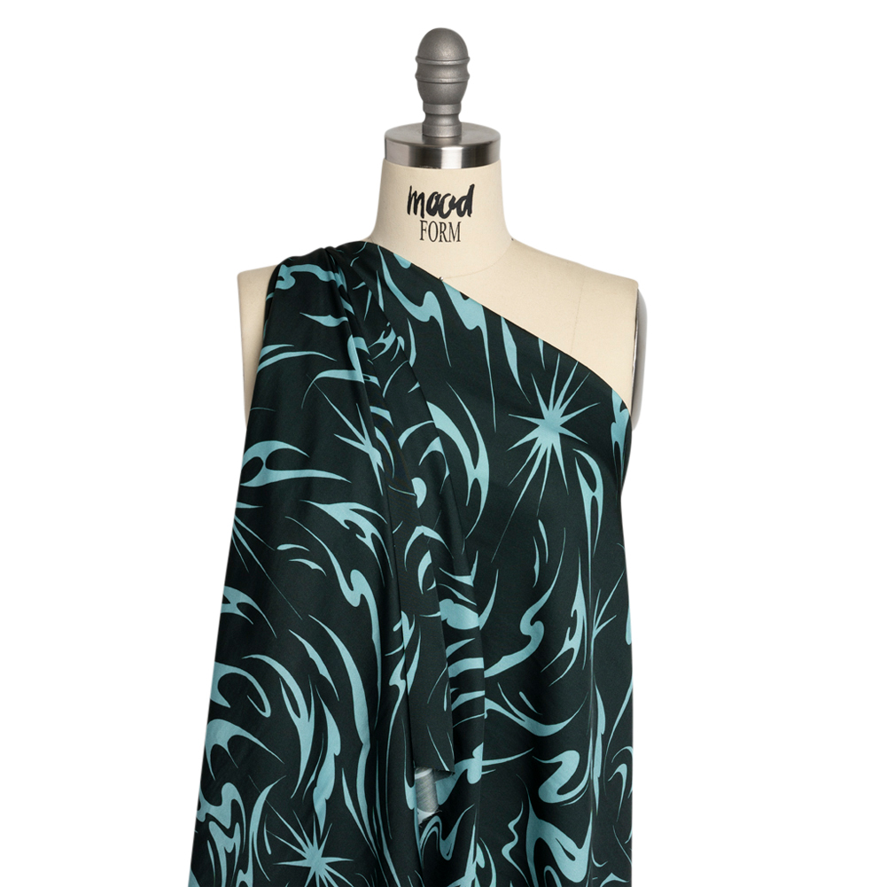 Our Mood Exclusive Blue Vincent's Hope Viscose and Recycled Polyester Satin displays an unpredictable night sky. The teal clouds part to show the north star shining in the navy sky; suddenly, there's hope for a starry night after all! This silky-smooth fabric boasts a subtle sheen, falling with a lightweight drape that brings an easy-going feel to every silhouette. Perfect for all seasons and occasions, imagine button-downs and maxi skirts in fall or airy dresses and handkerchief shirts in summer! When considering a lining, please note the translucent nature of this fabric.