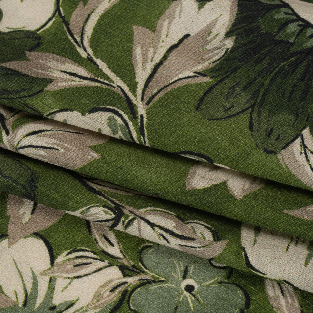 The air hangs low after a summer storm, coloring our Mood Exclusive Green Crowded Fields Sustainable Viscose Crepe in humid hues and lush light. It displays deeply green sunflowers and cream pansies, growing roots into a dark green background. Woven with sustainably sourced viscose fibers, this fabric features a pebbly hand and a fluid drape. Its cool, medium-weight feel on the skin is perfect for all climates; create airy skirts, a-line sundresses, workday button-ups, and more! As it is slightly transparent, a lining may be desired for complete opacity.