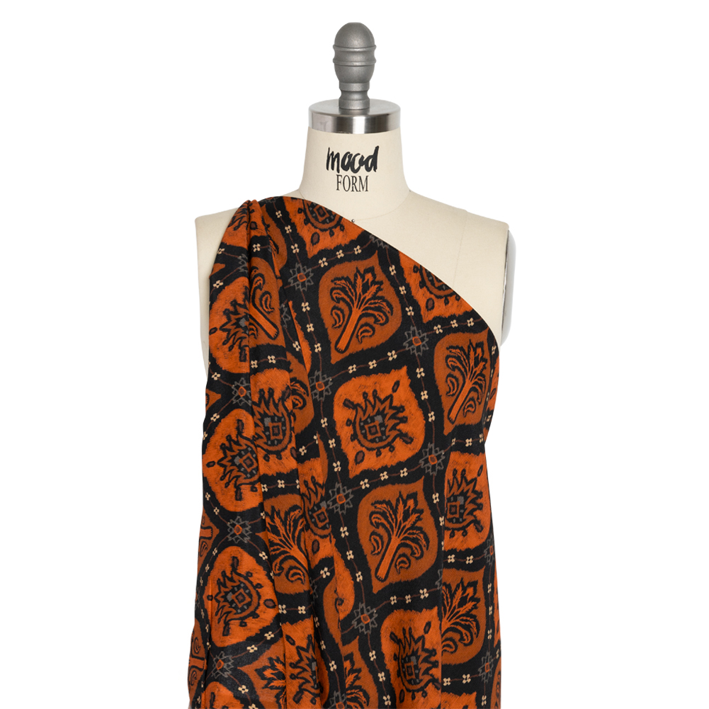 Inspired by the dark corners of history and New England in the fall, this Mood Exclusive Orange Salem Surroundings Sustainable Viscose Crepe sets fire to your wardrobe and empowers you to craft the garments that are uniquely you. Medallions of fiery bushes and ornate symbols cover a black background, surrounded by brown twigs and cream flowers. A grainy face gives way to a rippling drape, perfect for an airy silhouette and a temperate fall afternoon. Made of sustainably sourced fibers, this fabric lends its lightweight and mechanical stretch to maxi dresses, wrap-around tops, wide-leg pants, handkerchief skirts, and more! A lining is suggested to combat its translucent quality.