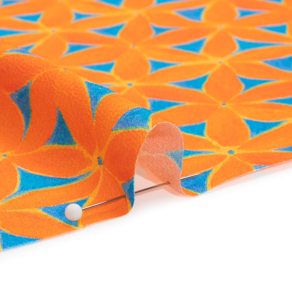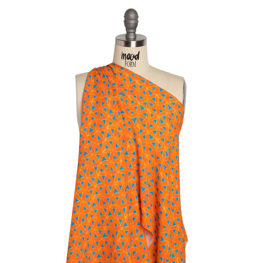 A jolt of summer shocks our Mood Exclusive Orange Lovely Lillies Sustainable Viscose Crepe, washing the warm sunshine through your wardrobe. Little lilies form a geometric-like pattern across the face; their bright orange petals complement the vibrant blue background, creating a high-energy yet simple look. Woven with sustainably sourced viscose fibers, this fabric features a pebbly hand and a fluid drape. Its cool, medium-weight feel on the skin is perfect for all climates; create airy skirts, a-line sundresses, workday button-ups, and more! As it is slightly transparent, a lining may be desired for complete opacity.Please Note: The dye lot of this fabric has changed as of June 2025. If you had previously ordered this material, please order a swatch to ensure the new dye lot meets your color requirements.