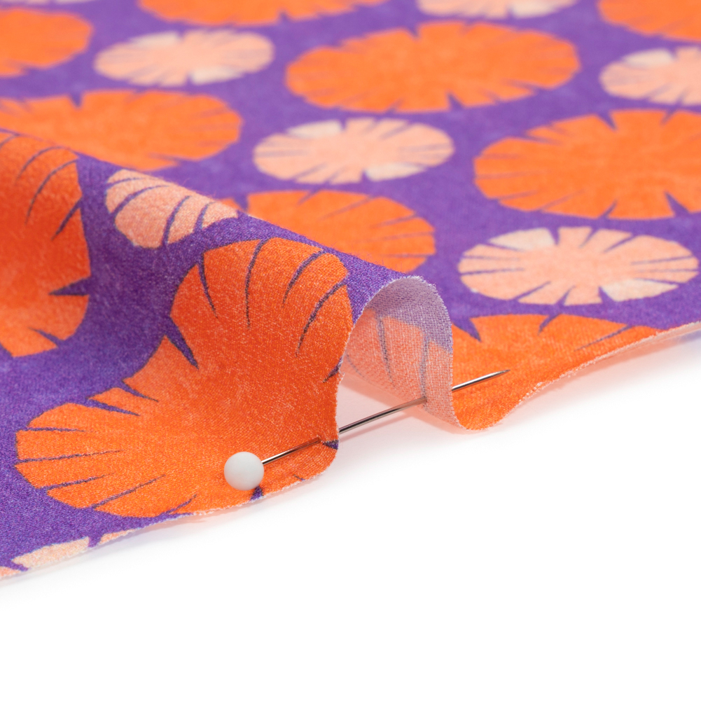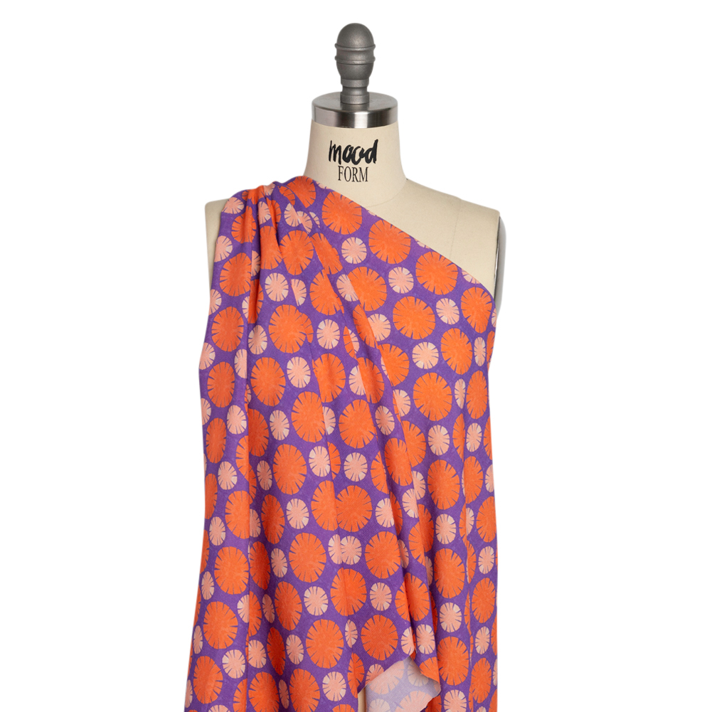 A flowering solar system expands across our Mood Exclusive Sunshine Grounds Sustainable Viscose Crepe. Abstract suns rise against a purple sky; pale pink and orange, large and small, they work together to create a joyful pattern of captivating symmetry. Woven with sustainably sourced viscose fibers, this fabric features a pebbly hand and a fluid drape. Its cool, medium-weight feel on the skin is perfect for all climates; create airy skirts, a-line sundresses, workday button-ups, and more! As it is slightly transparent, a lining may be desired for complete opacity.