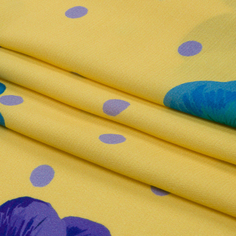 In going through a long-neglected closet, you've found treasures galore! Our Mood Exclusive Yellow Treasures Renewed Viscose Crepe presents a pattern of periwinkles polka dots surrounding purple and blue flowers on a golden yellow background, like grandma's pearls and a vintage dress, waiting for you to make them feel new and well-loved again. Made from viscose, this crepe bears a slightly pebbly texture with a bouncy, rippling drape. Lightweight and fluid, it's perfect for blouson blouses, free-spirited sundresses, or striking palazzo pants. Translucent, especially when light is shining through lighter colors, we suggest a lining for full opacity and extra body when desired.