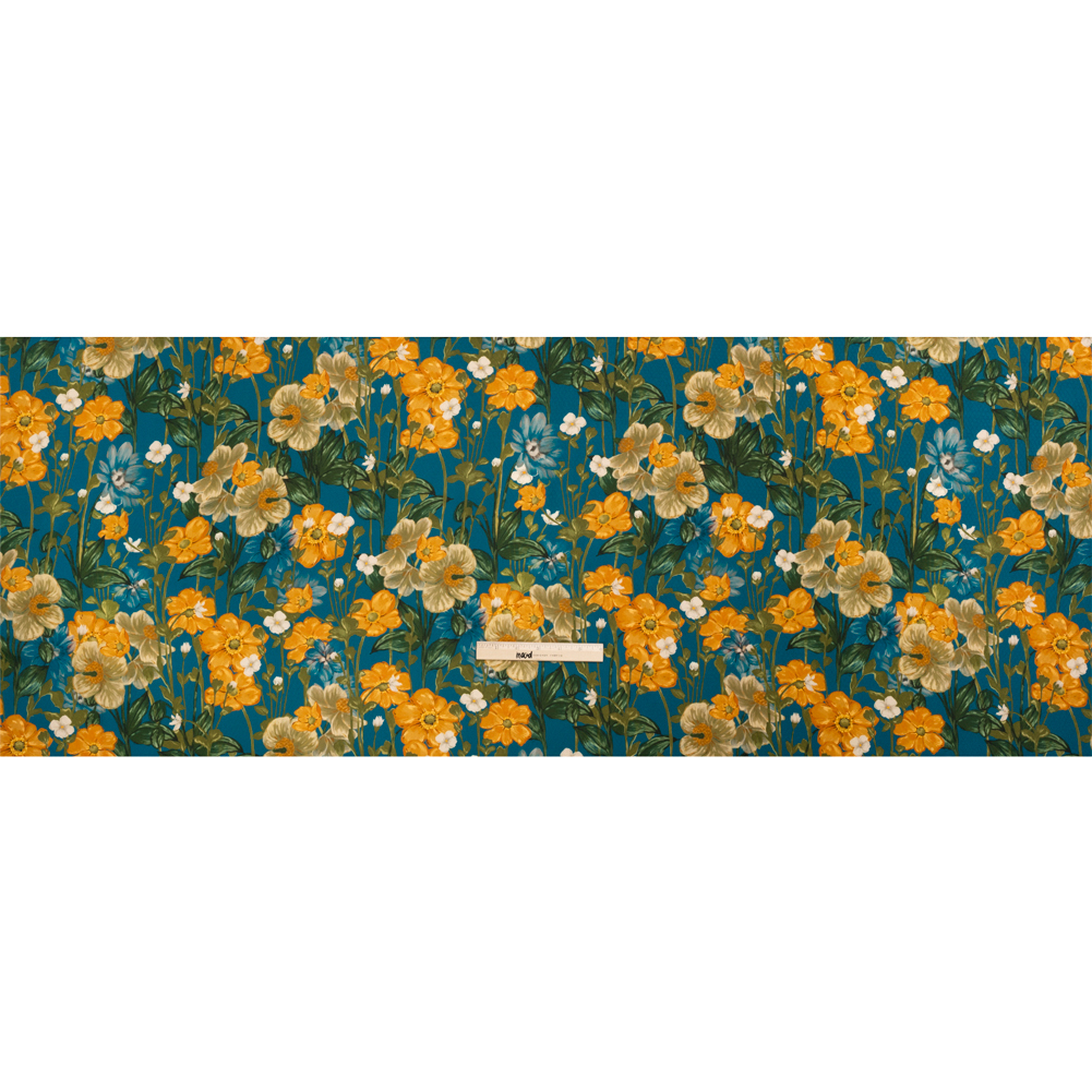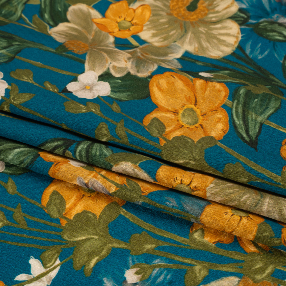 Sustainable Viscose Floral Jacquard Print - Blue, Green and Golden Orange Floral - Mood Exclusive Beautiful Day