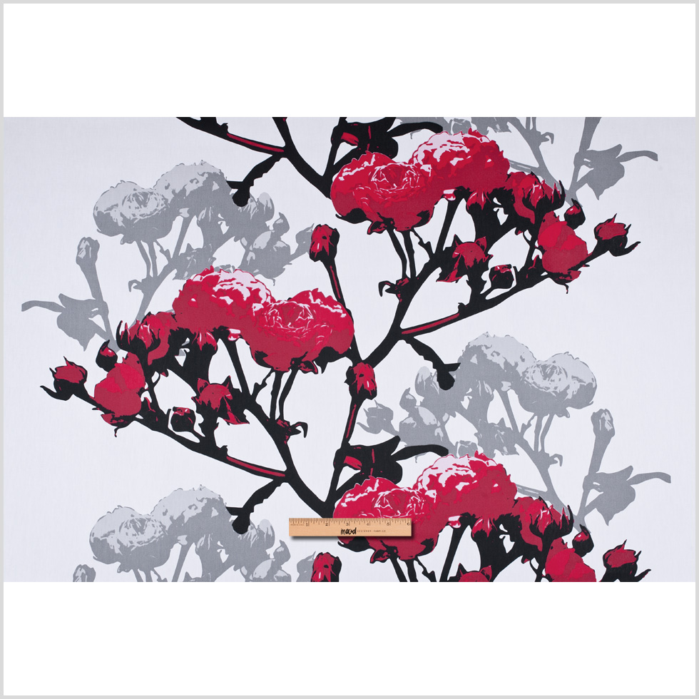 Here's a dynamic, bold print from Sweden. Giant roses in red and gray provide striking contrast against a white background. Cotton. We love this fabric as bold accent pieces in contemporary rooms.