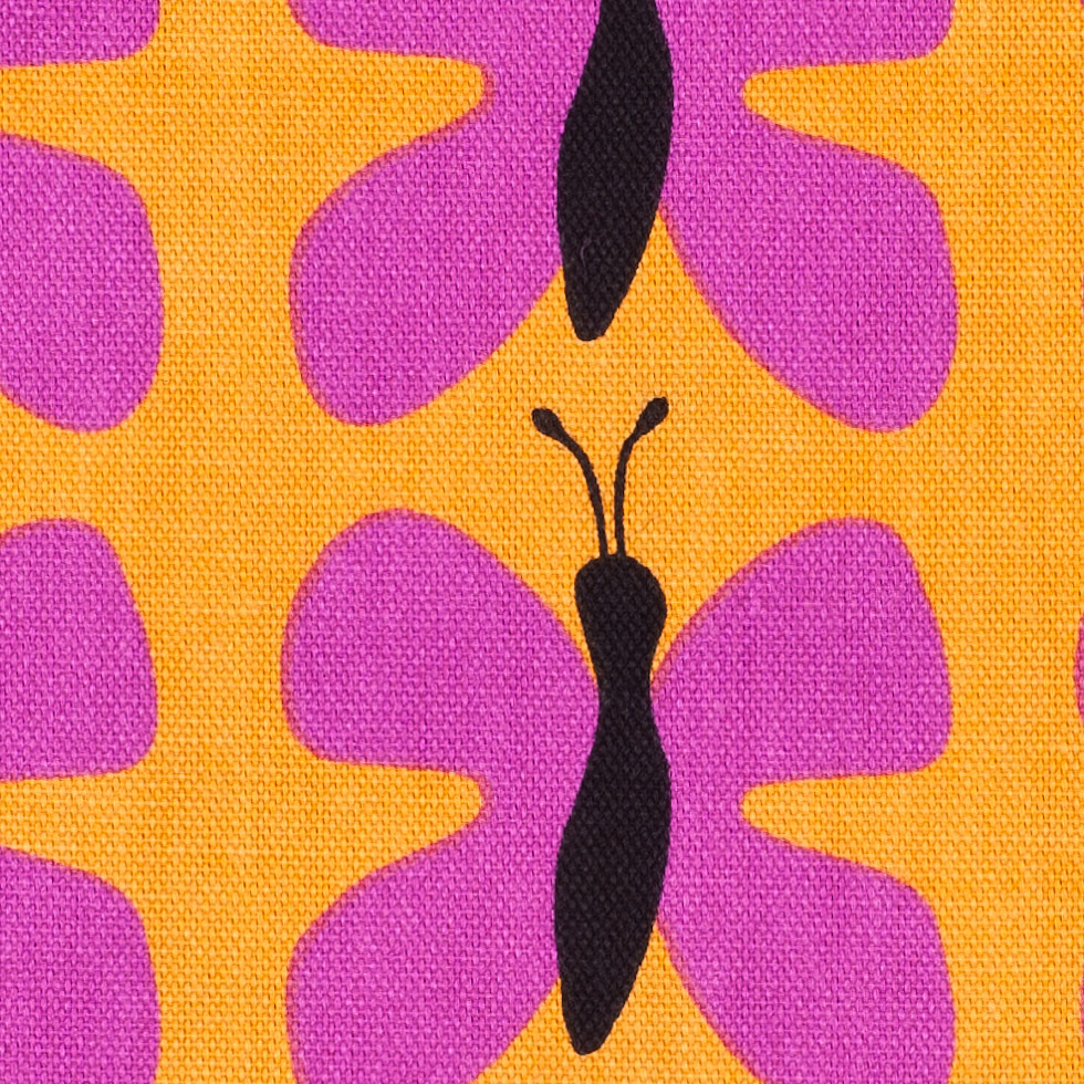 From Sweden, a fun and whimsical home cotton fabric that features small butterflies in pink and orange. We see this fabric as curtains, pillows and more in contemporary settings and kids' rooms.