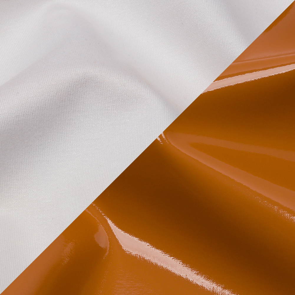 Luxury comes easy with this Tan Stretch Faux Patent Leather with White Viscose Jersey Backing. A slick tan coating makes up the face, while the reverse offers a lush sheen and incredible softness thanks to the rayon jersey back. With an all-way stretch of 50% and a flexible drape, create mini skirts, corset tops, dresses, and so much more. Opaque, a lining is not needed. WARNING: Cancer and Reproductive Harm - www.P65Warnings.ca.gov.