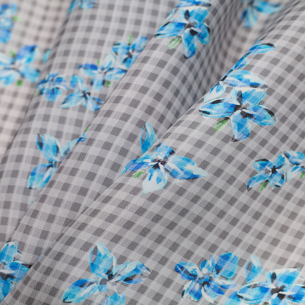 Tailored by Tanya Taylor, here is a spectacular silk gazar topped with a dynamic plaid and floral print in tints and shades or gray and blue. With the crisp hand and drape of an organza and the look of a regular woven, this light-weight silk fabric is a gem to say the least. Slightly translucent, use this designer silk fabric to create voluminous and structural dresses, skirts, jackets and more. Lining this material is dependent on the application as well as personal preference.