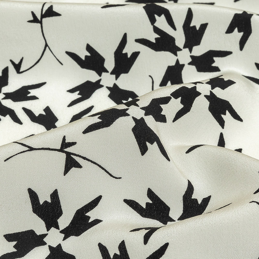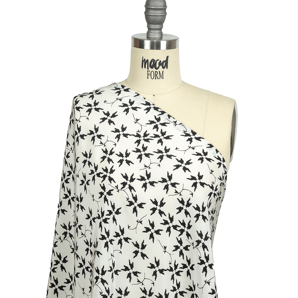 Known for her fabulously whimsical prints, Tanya Taylor provides playful luxury with this White and Black Geometric Floral Silk Crepe de Chine! Black houndstooth checks whorl in floral clusters of four, accented with stems for a delicate finish. Crepe de chine combines a subtly lustrous face with crepe's unbeatable fluidity and lightness, plus a pebbly, grainy texture to match. Create pussy-bow blouses, fluid wrap dresses, or luxurious silk scarves and pocket squares. Highly translucent, a lining will add extra structure and opacity but isn't necessary for all projects.