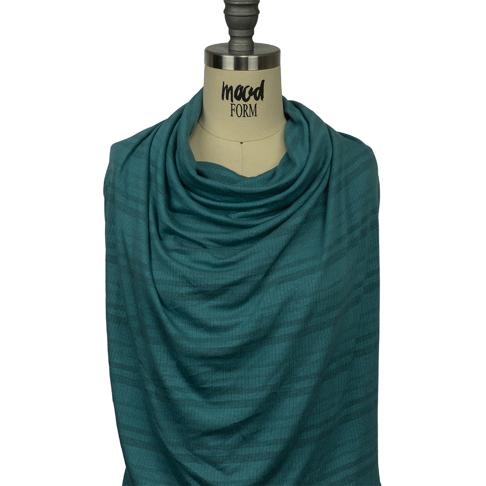 Let this Teal and Charcoal Striped Stretch Rayon Rib Knit keep you cozy when the temperature drops. Displaying a teal base with subtle charcoal stripes, the ribbed pattern adds a subtle texture and a generous 75% widthwise stretch, exceeding the amount of stretch present along the lengthwise grain. With a supple drape, design oversized cardigans, hooded sweaters, tunics, tanks, and more. Though somewhat translucent, a lining is not necessary for most applications.