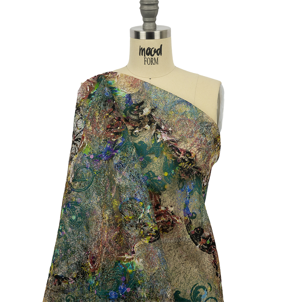 Become lost in the intricate details of this spellbinding Teal and Maroon Rose Garden Printed Metallic Webbing! On top of a metallic webbed backdrop, the fabric displays an ethereal garden in printed shades of teal, maroon, blue, and gold, outlined with glitter to add to its magical flair. Created with a full drape and slight mechanical give, its adorned surface offers a myriad of textures to keep things interesting. Own the red carpet by creating statement blazers, dresses, ballgowns, or elegant skirts! Due to the fabric being see-through, we recommend adding a lining for complete opacity and comfort in wear.
