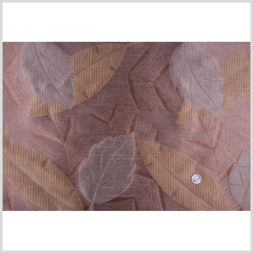 This is a woven polyester in terracotta with various size, shape, and color leaves. Very classy, medium weight, great for drapes.
