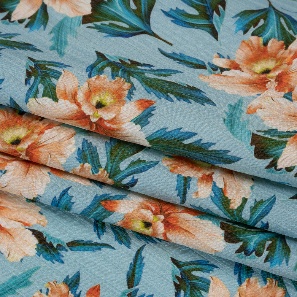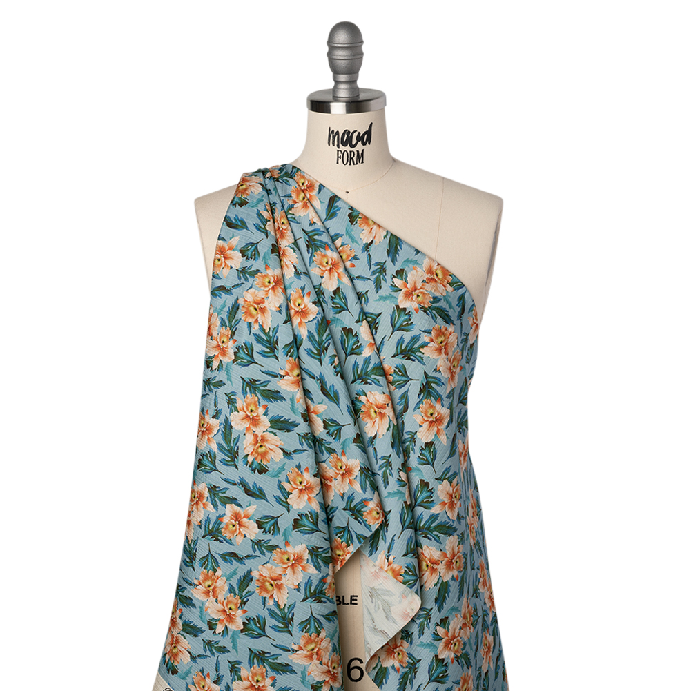 Add some alluring texture to your wardrobe with this Flowers and Leaves Textured Stripe Silk Dobby—featuring a sleek hand and fluid drape.Suggested Projects: Blouses, Shawls, Skirts, DressesContent: 100% SilkStretch: NoneOpacity: TranslucentPeach blossoms and deep teal leaves burst vividly against a sky blue backdrop on this silk dobby, where subtle woven stripes lend a whisper of luxury and a softly textured touch. With its sleek hand and airy drape, this fabric calls for flowing silhouettes that capture the ease of warm days and golden afternoons. Imagine ruffled maxi-dresses swaying with each step, wide-legged pants that catch the breeze, and breezy blouses that feel like a soft sigh against the skin. Sheer by nature, consider layering or adding a lining to achieve your desired level of opacity.