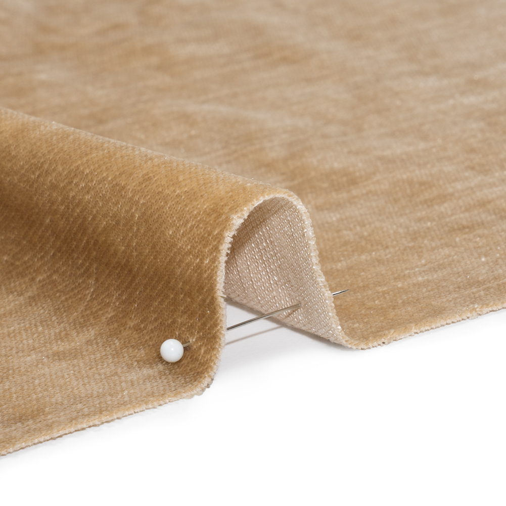 Turn a couch into a throne with this luxe Ainslie Frappe Textured Upholstery Velvet. The champagne face yields more than just the signature texture of velvet—very discreet striations hide behind the blinding luster, offering a subtle dimension to the soft and sleek hand. It features a medium-weight feel, a malleable drape, and a slubbed woven on its reverse. With a luxury that has captivated ancient royals to modern designers, this mature textile effortlessly elevates your formal living room ottoman, your tufted headboard, your piano bench cushion, and more.Here are some sewing tips from our professional velvet experts: Before cutting and stitching your velvet, decide which way your pile is facing and stick with it.Test on a scrap piece first—you may want to adjust presser foot tension and use a longer stitchCutting on the wrong (reverse) side will ensure accurate markings.Velvet is slick: cutting in one layer (with a rotary cutter!) and using a walking foot will prevent slipping; hand basting your seam lines will prevent creeping.
