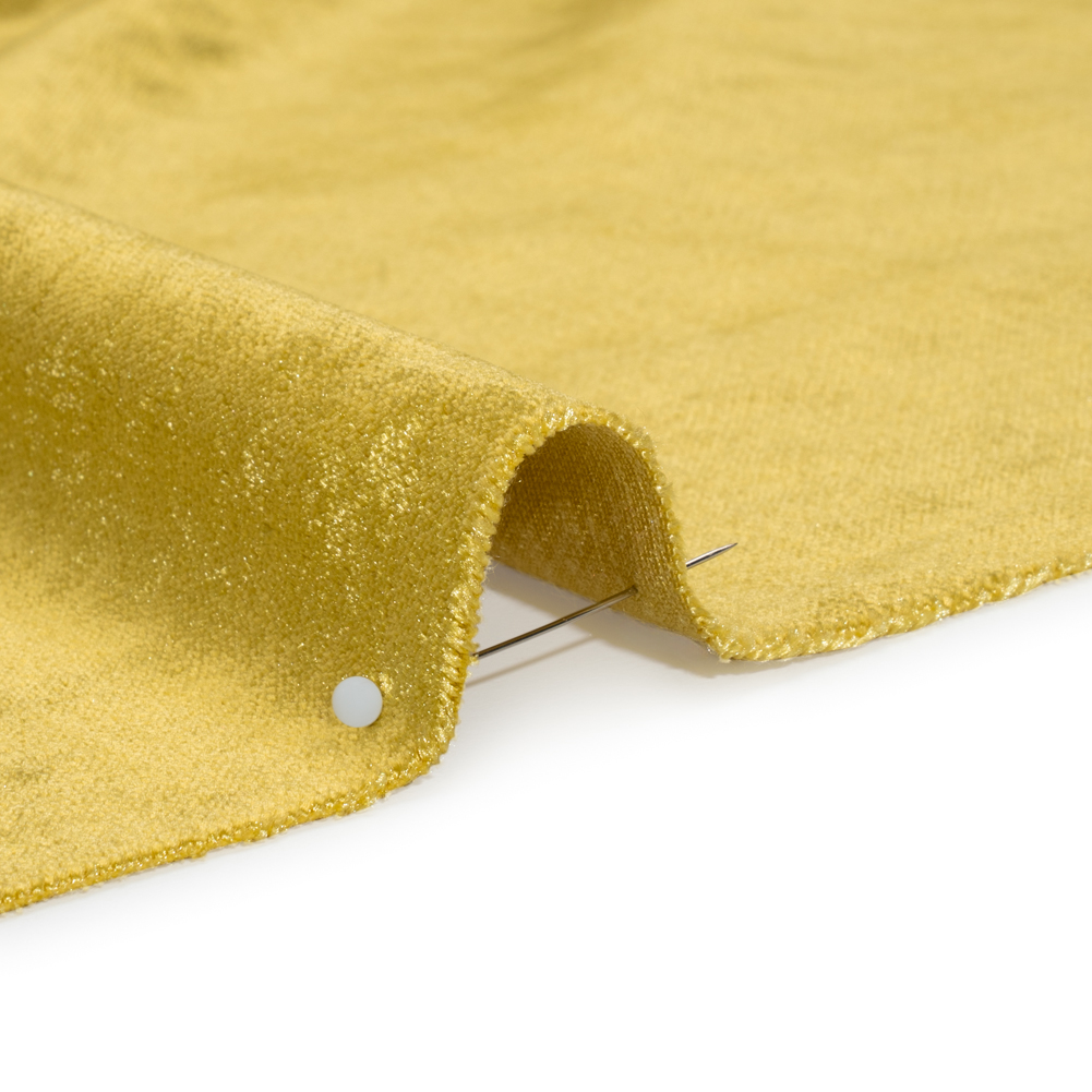 Invigorate your life with this Ainslie Lemonade Textured Upholstery Velvet! The yellow face yields more than just the signature texture of velvet—very discreet striations hide behind the blinding luster, offering a subtle dimension to the soft and sleek hand. It features a medium-weight feel, a malleable drape, and a slubbed woven on its reverse. With a luxury that has captivated ancient royals to modern designers, this mature textile effortlessly elevates your formal living room ottoman, your tufted headboard, your piano bench cushion, and more.Here are some sewing tips from our professional velvet experts: Before cutting and stitching your velvet, decide which way your pile is facing and stick with it.Test on a scrap piece first—you may want to adjust presser foot tension and use a longer stitchCutting on the wrong (reverse) side will ensure accurate markings.Velvet is slick: cutting in one layer (with a rotary cutter!) and using a walking foot will prevent slipping; hand basting your seam lines will prevent creeping.