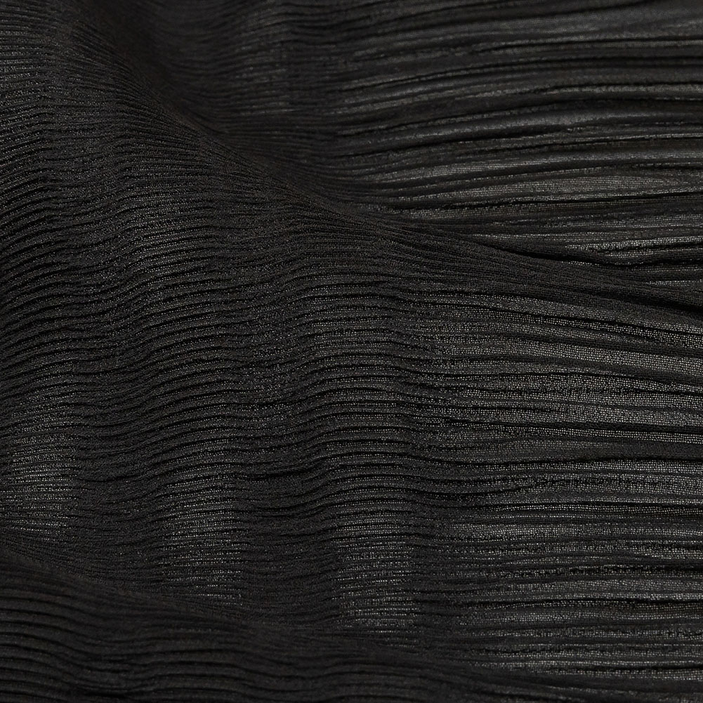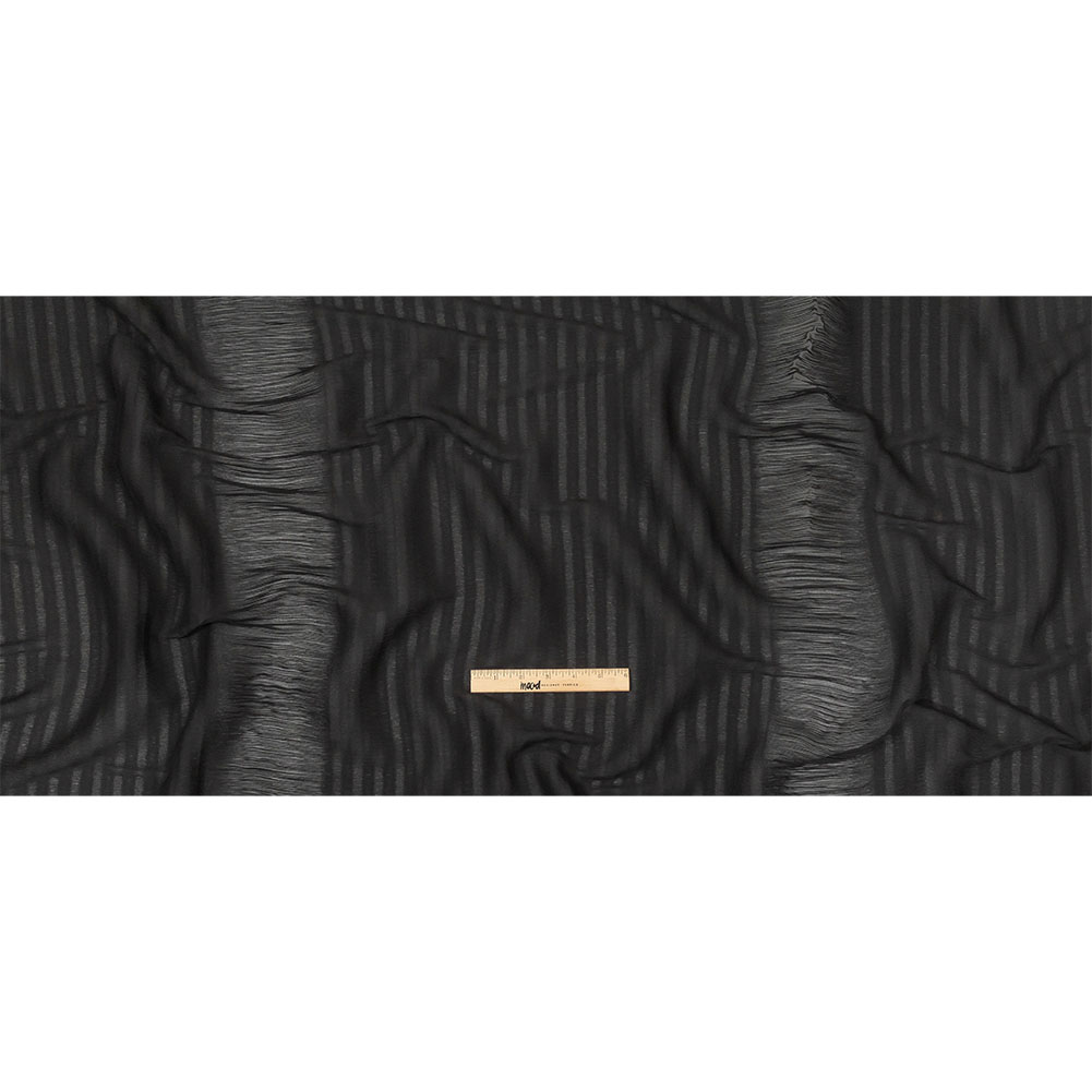 Be amazed by the stylish possibilities presented by this Italian Black Pleated Stripes Polyester Chiffon by The Row! A cross between pleated, ruched, and plisse fabrics, this unique chiffon features mesmerizing pleated stripes, alternating in width while maintaining a pebbly, coarse texture. Bouncy and lightweight with a malleable drape, fashion blouses, dresses, or skirts. Sheer, a lining may be desired for full opacity and structurePlease note: While this fabric appears to have give along the width, it should be treated and sewn as a woven, non-stretch fabric.