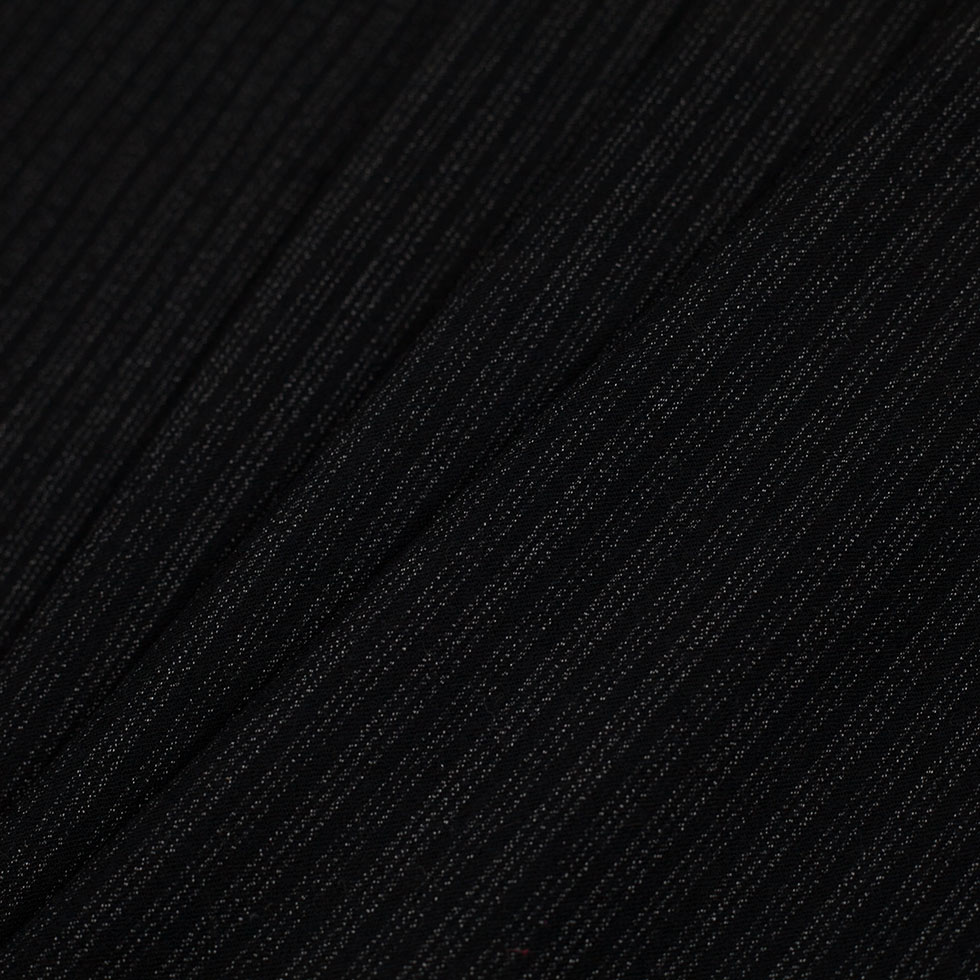 You might be asking does this have a metallic stripe? Well think again. Due to the specific weave of this material, it appears to contain metallic yarns from far away. However, if you take a closer look, the stripes are actually formed by matte, white cotton yarns woven through this black virgin wool material. This fabric is light-weight, super soft, and contains a nice soft drape. Use this material to create stylish shirts, gorgeous skirts, wonderful dresses, and more!