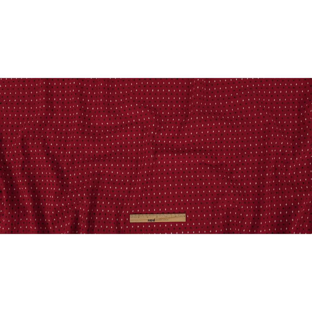 Look fabulous from head to tomato in this Tomato Puree, Vanilla Ice and Black Diamonds Brushed Blended Cotton Jacquard! On a fuzzy, brushed red face, diamonds form from four points on thread peeking through, alternating between white and black, while the reverse shows off stripes of floating threads that make the Jacquard weave pattern possible.