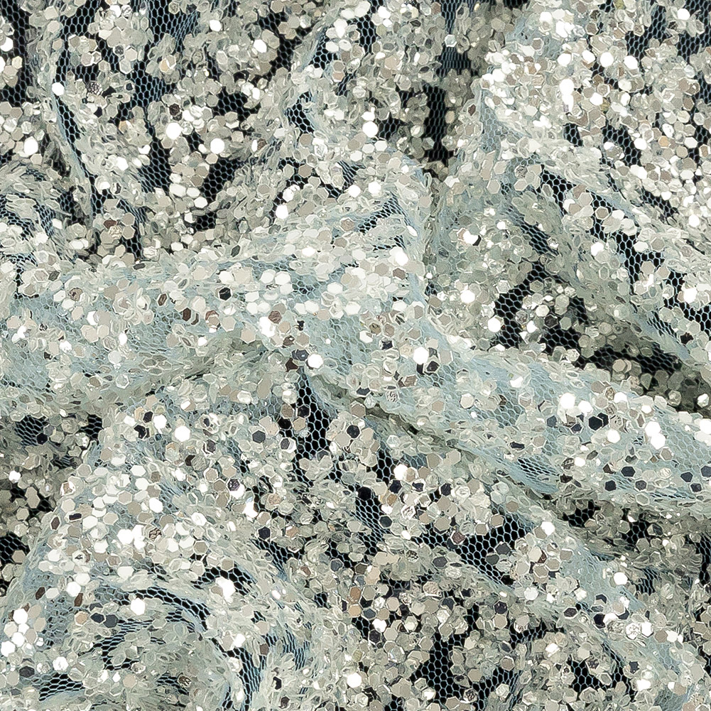 Chase your blues away with this premium Blue Luxury Tulle with Platinum Glitter Clusters! Featuring a coarse hand and fluid drape, this tulle is a spectacular addition to special occasion creations.Suggested Projects: Dresses, Skirts, Tutus, OverlaysContent: 100% PolyesterStretch: NoneOpacity: SheerDiscs of bright silver glitter add a shimmering dimension to a backing of blue tulle, leaving roughly 2 inches uncoated at either selvage. A heavy but flexible drape meets a strangely sandpaper-like texture for a statement piece perfect for party dresses, flamboyant skirts, tutus, and more. Slightly sheer, a lining is a must for opacity purposes and recommended for comfortability as well. Note: These products are very sensitive and not suitable for dry cleaning. It is recommended to hand wash only in cold water and without bleaching.