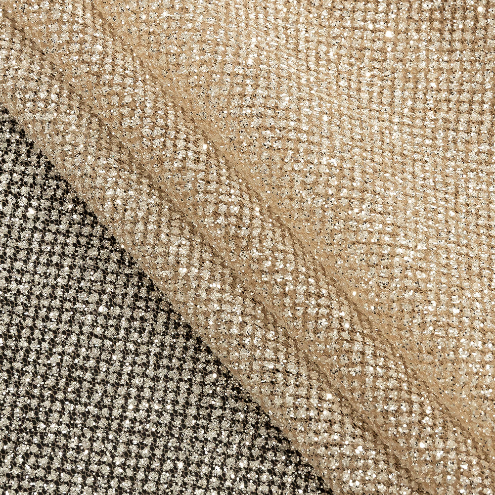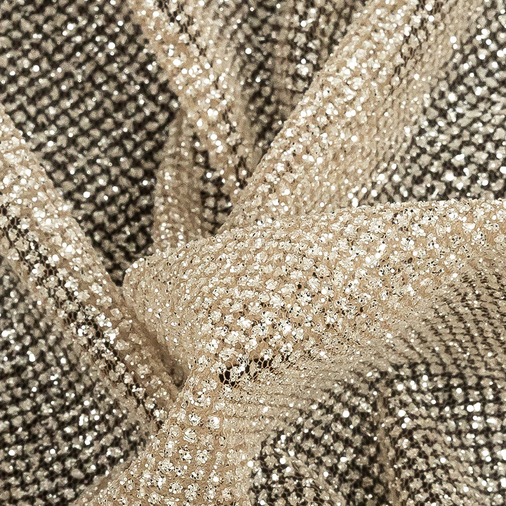 Bare your love of glitter with this Nude Tulle with Metallic Platinum Glitter! Featuring a coarse hand and crisp drape, this fabric is a fanciful dream!Suggested Projects: Overlays for Gowns, Skirts, and TutusContent: 100% PolyesterStretch: NoneOpacity: SheerIntroducing a beige tulle base that glimmers due to a fine coating of platinum glitter. With a somewhat rough hand and crisp drape, this tulle is perfect for overlays on evening wear, fluffy skirts, and tutus as well as costumes or anything else that requires a little sparkle and a lot of volume. Sheer, a lining is a must for opacity and ideal for enhanced comfortability. Note: These products are very sensitive and not suitable for dry cleaning. It is recommended to hand wash only in cold water and without bleaching.