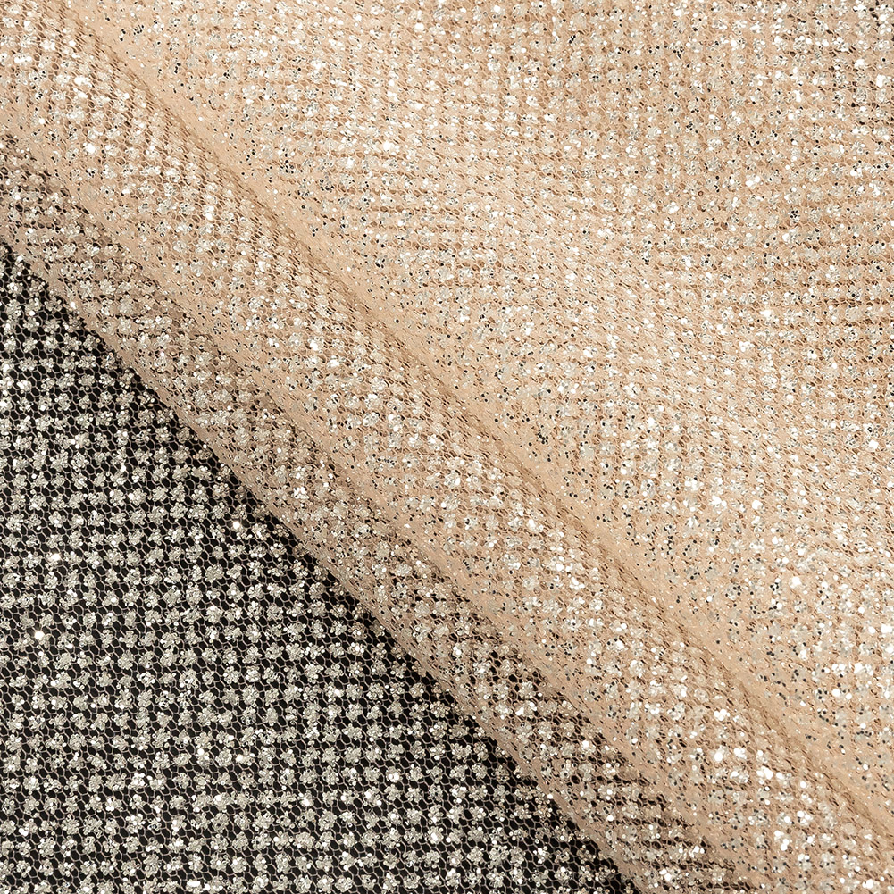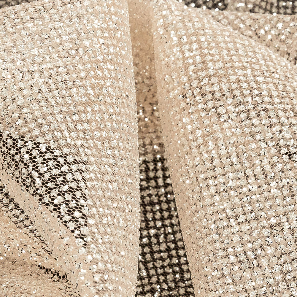There’s nothing fishy about loving this Salmon Tulle with Metallic Platinum Glitter! Featuring a coarse hand and crisp drape, this fabric is a fanciful dream!Suggested Projects: Overlays for Gowns, Skirts, and TutusContent: 100% PolyesterStretch: NoneOpacity: SheerIntroducing a warm pink tulle base that glimmers due to a fine coating of platinum glitter.