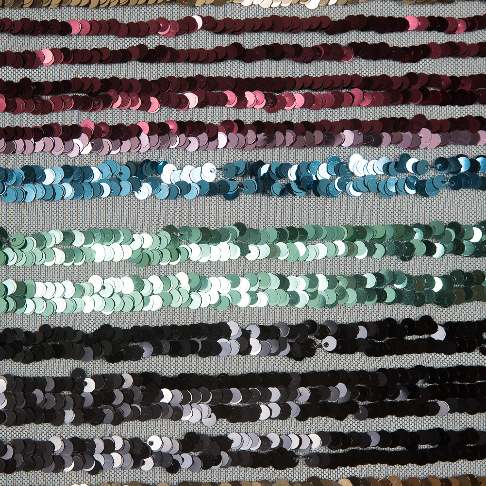 After a long time looking, this Shiny Rainbow Striped Sequin Fabric is finally at the end of the rainbow. Delicate tulle holds stripes of multicolored sequins to create an shimmering spectrum of delicate decoration perfect for flapper dresses, statement-making bolero jackets, home decor and more! Given the transparent nature of the base fabric, a lining may be needed if additional structure or modesty are desired.