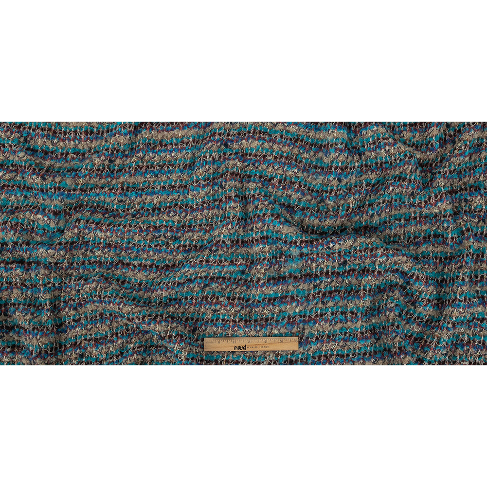 You'll be instantly transported to a beachy scene with the bright tones on our Turquoise, Blue, and Gray Loopy Wool Sweater Knit. Vibrantly bold stripes of luscious turquoise run across the weft of this fabric, with hues of taupe, coral, and burgundy supporting it throughout. Featuring a deliciously floccose hand and an easy, snug drape, we don't doubt you'll create marvels with such a material. Craft cropped turtlenecks, sweater vests, oversized cardigans, and cold-weather accessories using this knit! Given its slightly open construction, this fabric is not considered fully opaque, consider layering when complete opacity is desired.