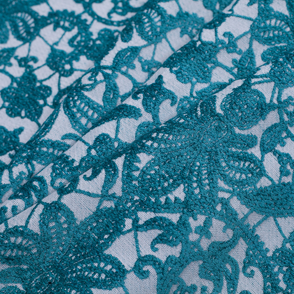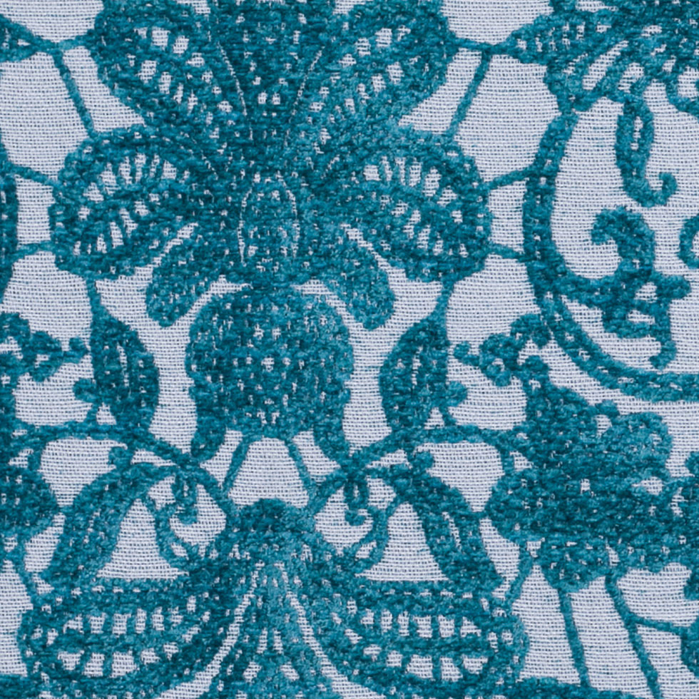Traveling all the way from Turkey, we have a gorgeous, velvety, turquoise, floral pattern embroidered on top of a white, basic, basket-woven material. Medium-weight, this material would be great for striking upholstery, unique drapery, and rich home decor.