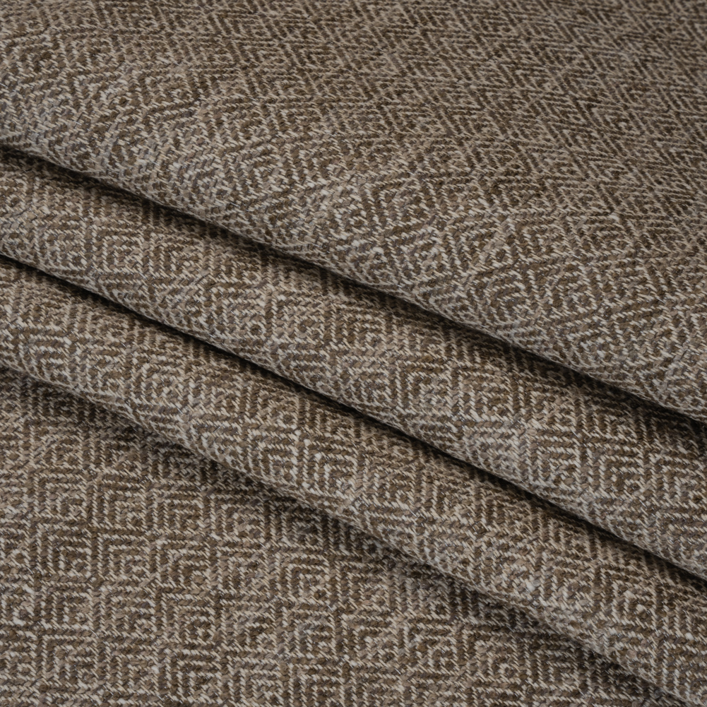 Burrow deep into this Mink Diamonds Tweedy Boucle Upholstery Jacquard. With a soft, plush hand and malleable drape, the feel of this fabric is to diamond for.Suggested Projects: Armchairs, Sofas, Ottomans, SectionalsContent: 82% Polyester, 18% CottonStretch: NoneOpacity: Mostly OpaqueTweed love nothing more than to take a day off work to lounge atop this upholstery jacquard. In classic jacquard style, the face boasts ombre mink brown diamonds—lined with beige threads—and the back dons the inverse. The iconic texture is a midday-nap-instigator and compliment-creator, igniting conversations regarding its lustrous finish and welcoming cozy gatherings on its plush face. Heavy and featuring a malleable drape, this fabric is ideal for both large and small upholstery projects, ranging from throw pillows and ottomans to sectionals and chaises.