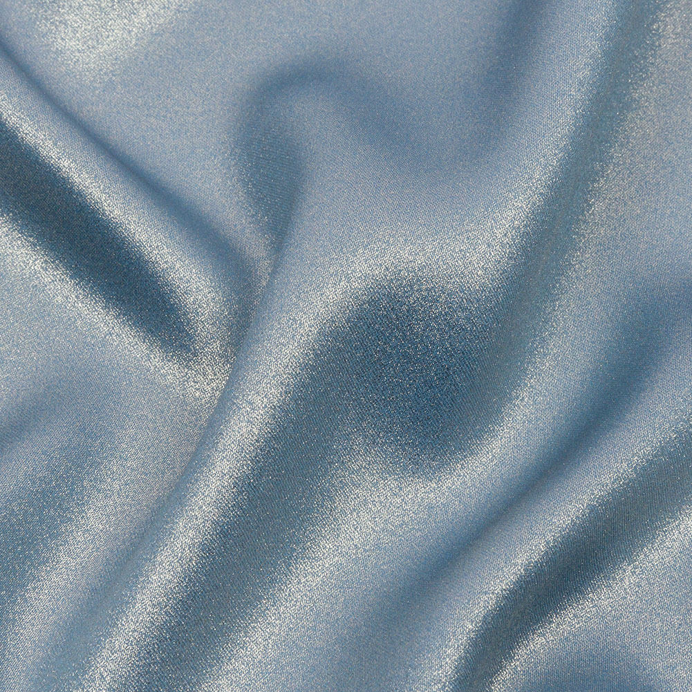 Designs will shine like never before with this Valeria Blue and Silver Foiled Ultra-Smooth Polyester Georgette. Brilliant silver foiling covers the face of the material, lending a brilliant metallic shine. Despite its crepe construction, this georgette lacks the characteristic graininess and instead features a smooth, soft hand. With its fluid drape, create wrap or pleated dresses, vintage-inspired gowns, ruffled blouses, and so much more. While mostly opaque, a lining can be used for structure if desired.