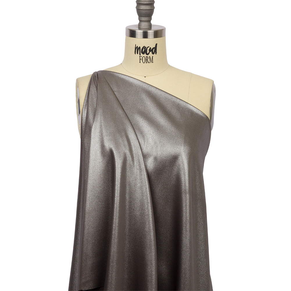 Your designs will be simply divine in this Valeria Brown and Silver Foiled Ultra-Smooth Polyester Georgette, because you can't go wrong with silver. Brilliant silver foiling covers the face of the material, lending a brilliant metallic shine. Despite its crepe construction, this georgette lacks the characteristic graininess and instead features a smooth, soft hand. With its fluid drape, create wrap or pleated dresses, vintage-inspired gowns, ruffled blouses, and so much more. While mostly opaque, a lining can be used for structure if desired.