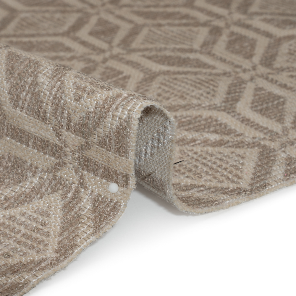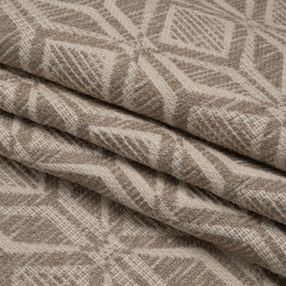 Sandy vistas come to mind when you unfurl this Gray Diamonds and Squares Geometric Upholstery Jacquard. With a soft, tactile hand and malleable drape, this fabric is sure to stay in style.Suggested Projects: Armchairs, Couches, Ottomans, HeadboardsContent: 81% Polyester, 19% CottonStretch: NoneOpacity: OpaqueBeige squares and diamonds rest atop a grayish-brown backdrop, forming a striking, tile-inspired geometric pattern. With a tactile, slubbed hand and malleable drape, it’s perfect for upholstering armchairs, couches, ottomans, headboards, and beyond! Opaque, a lining is not necessary for most applications. Please note: Due to the nature of the design, about 52” of the 54” width is usable.