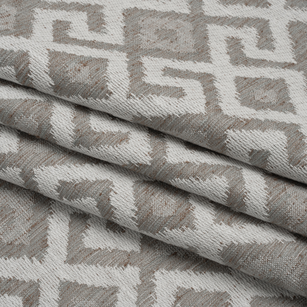 A storm of inspiration blows in with this Gray Greek Key Diamonds Upholstery Jacquard. With a tactile hand and malleable drape, it’s the key to your next interior design.Suggested Projects: Armchairs, Couches, Ottomans, HeadboardsContent: 86% Polyester, 14% CottonStretch: NoneOpacity: Mostly OpaqueA striking white Greek-key diamond motif dances across this stormy gray jacquard, echoing the timeless artistry of Greek pottery, architecture, and textiles—a tribute to the twisting, winding rivers of antiquity. With a tactile, slubbed hand and malleable drape, it’s perfect for upholstering armchairs, couches, ottomans, headboards, and beyond! Mostly opaque, a lining is not necessary for most applications. Please note: Due to the nature of the design, about 52” of the 54” width is usable.