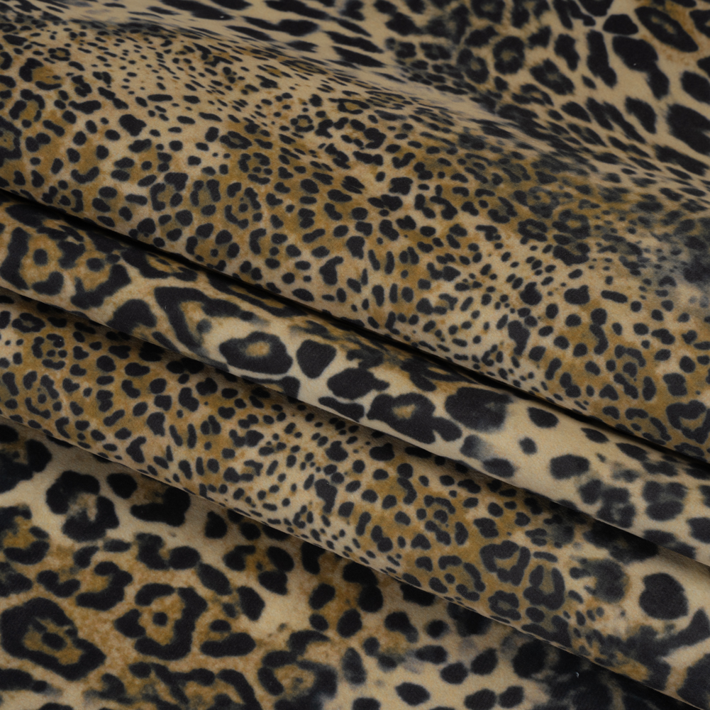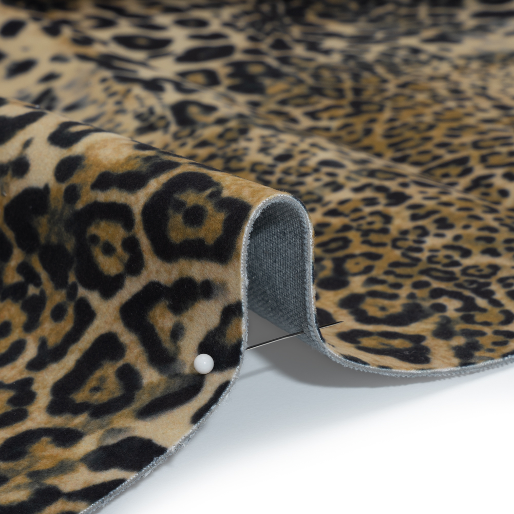 Connect to your wild side with this Leopard Spots Upholstery Micro Velvet! With a luxuriously soft hand and a stiff yet supple drape—thanks to a woven backing—it’s sure to create statement home decor.Suggested Projects: Couches, Cushions, Ottomans, HeadboardsContent: 100% PolyesterStretch: NoneOpacity: OpaqueBring haute animal prints into your home decor with this upholstery microvelvet. Its luxuriously soft hand and stiff yet supple drape pair perfectly with a matte, almost suede-like visual finish. A woven backing not only increases durability but ensures a fully opaque experience. In a striking black and tan leopard spots print, this fabric lends itself beautifully to tufted headboards and statement cushions…or even entire couches sure to pull the eye.