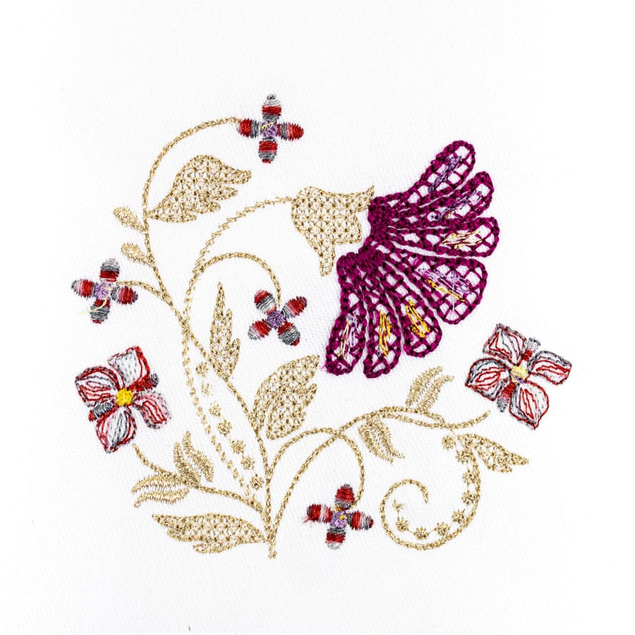 This pack includes a mix of luxurious threads that add both texture and shine to your work. You'll find 12wt GlaMore™ rayon/metallic thread for bold stitches, FabuLux™ 40wt trilobal polyester for vivid decorative work, 40wt Spotlite™ rayon core metallic for a refined shimmer, 40wt Mirage™ random-dyed rayon for variegated effects, and 12wt Accent™ rayon for standout detail.