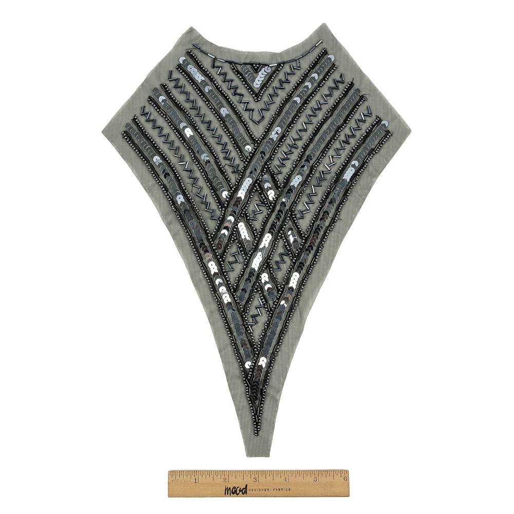 Timeless glamour is yours with this Vintage Black and Gunmetal Sequins and Zig-Zag Bugle Beaded Sheer Panel Appliqué! Gently curving lines of gunmetal sequins shimmer between rows of gunmetal seed beads and zigzagging lines of black bugle beads, all atop a sheer black mesh backing.
