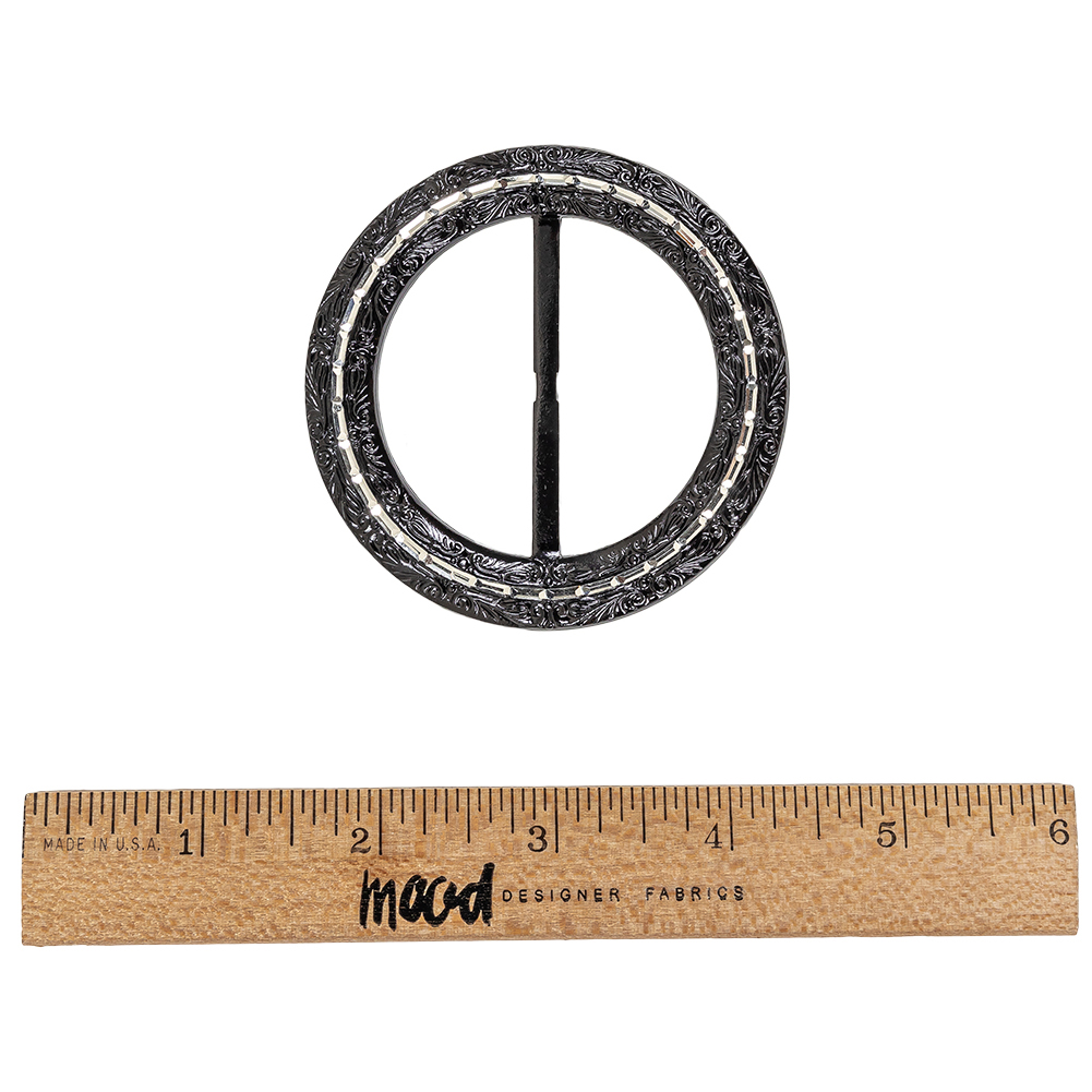 Bring glamor black with our Vintage Black Classical Swirls Round Slider with Faceted Silver Band! Classical swirls mix amongst a black background, interrupted by a sparkling silver band. Give belts on jumpsuits, dresses, trenches, and more a little extra oomph!Please note: This slider measures 2¾ inches long by 2¾ inches wide, and will fit a strap up to 2 inches wide.