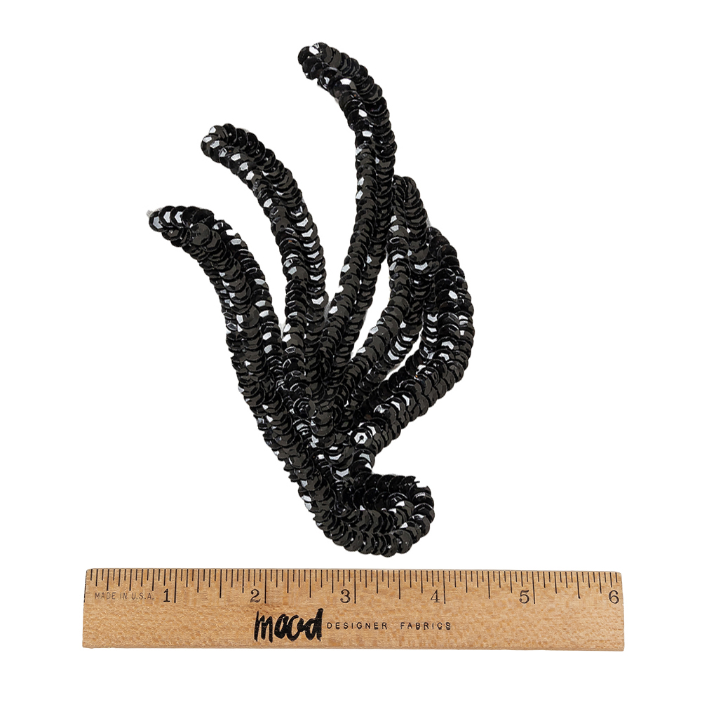 Elevate any garment with this avant-garde Vintage Black Sequined Abstract Left Side Appliqué! Curved lines of black sequins mimic the natural shape of ferns and fronds, each glimmering in the light. Make a fashionable statement on evening gowns, lingerie, sleeves, and skirts.Please note: The dimensions of this piece measure 5¼ inches long by 3⅝ inches wide. WARNING: Cancer and Reproductive Harm - www.P65Warnings.ca.gov.