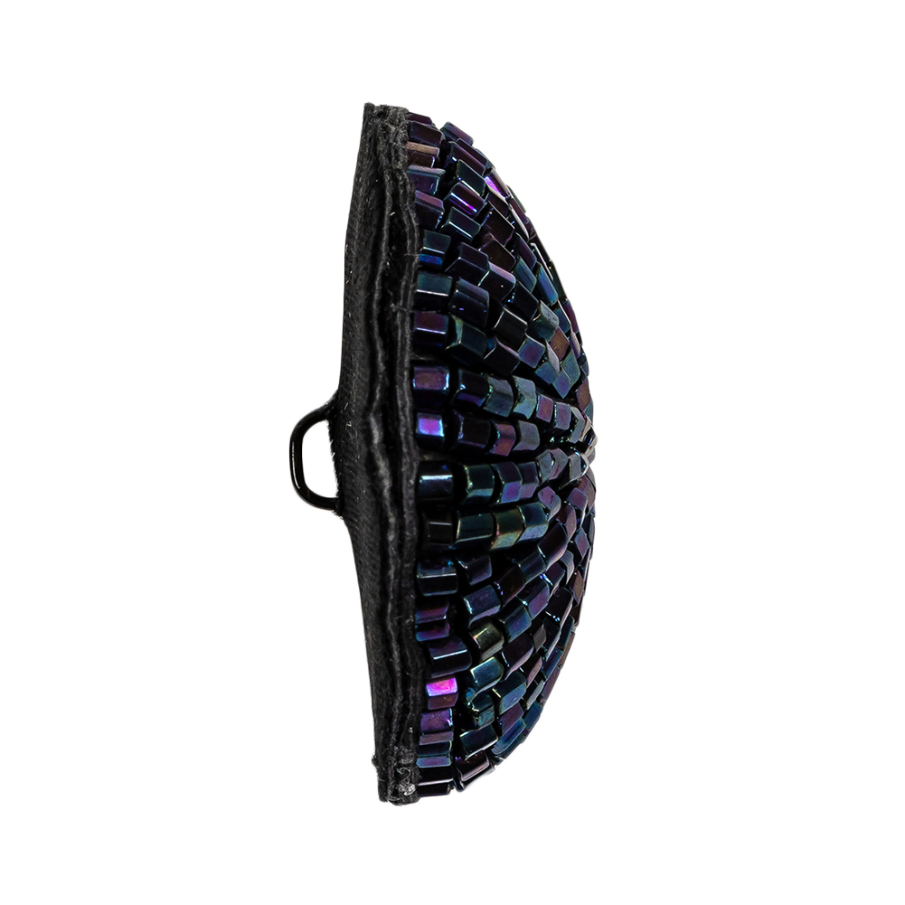 This particular Vintage Blue Iris Beaded Dome Shaped Button features iridescent blue seed beads throughout, which glimmer in shades of pink and green and everything in between! The reverse displays a fabric-covered backing and slim metal shank.