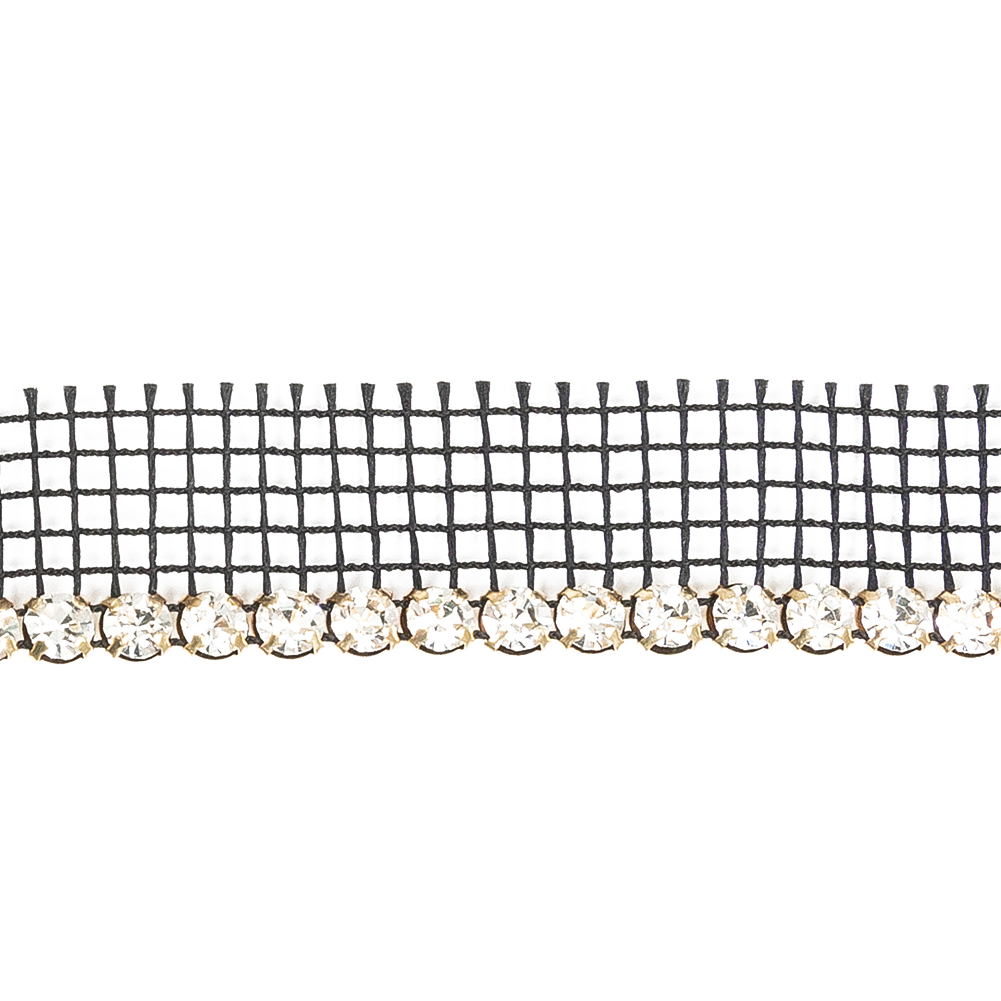 Make a dramatic splash in gold and black with these Crystal and Gold 1 Row Circular Rhinestones on Black Mesh Trimming! From the Czech Republic, this trim features a single row of circular clear rhinestones in gold settings attached to a ¾ inch wide strip of black mesh for easy application.