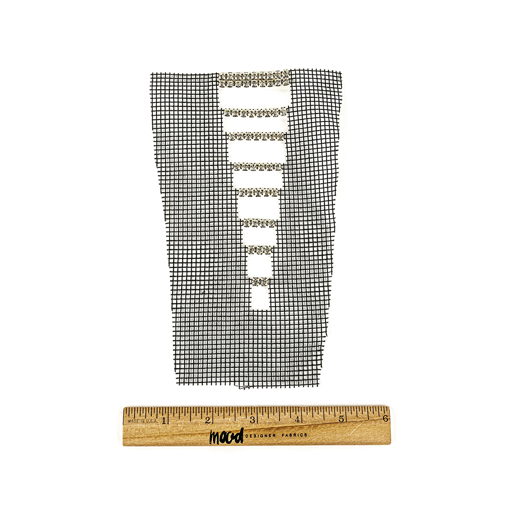 You won't be able to quit Czech-ing yourself out once you outfit your designs in our Vintage Czech Crystal Rhinestones on Black Mesh Appliqué. Consider this detail as a swanky addition to a satin gown with an open backside or create a tasteful décolletage in a silk blouse. The prismatic shine found in these rhinestones will give your pieces the tasteful sparkle they need.The rhinestones have a gauge of 3.9 mm that are supported by a .55 mm widely constructed mesh backing.Please note: Due to the nature of its construction, the dimensions may vary slightly from piece to piece.
