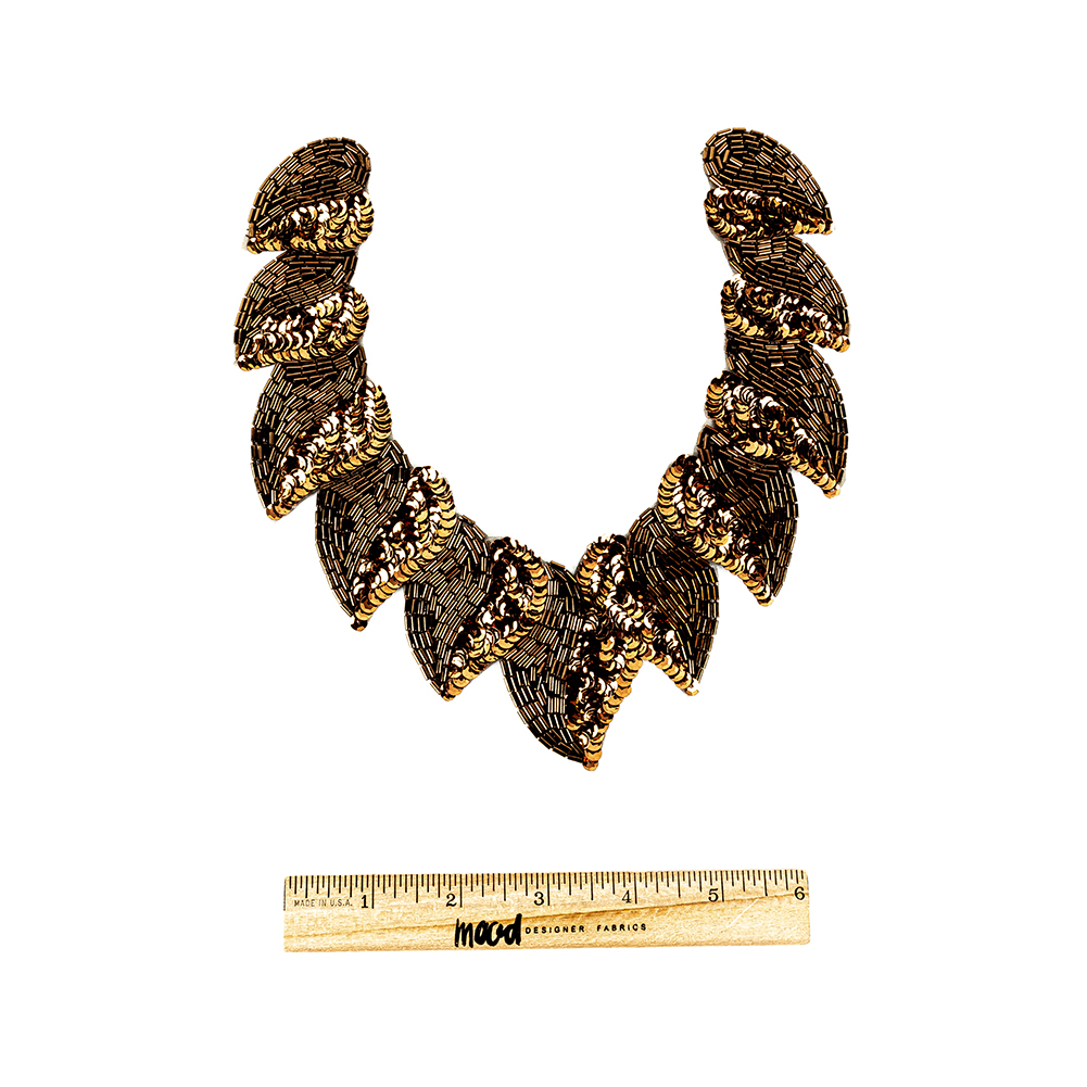 You won't be-leaf the incredible sparkling interplay of earthen tones, organic shapes, and metallic sequins on this Vintage Fancy Bronze Sequins and Bugle Beaded Neckline Appliqué! In dreamy dark bronze, shimmering sequins and sparkling bugle beads form a nearly wreath-like appliqué of leafy forms, with contrast provided in the textures of the different elements.Measuring 7.625 inches by 7.375 inches overall, the length of the leaves varies from 2 inches to 2.5 inches. However, due to the nature of their construction, dimensions may vary slightly from piece to piece.Become the darkly magical forest fairy of your dreams and attach this appliqué to dresses, gowns, and blouses for ethereal elegance with an earthbound edge.