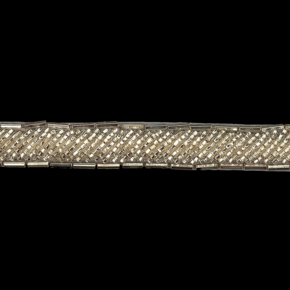 Find your sparkle with this Vintage Fancy Off-White and Silver Bugle Beaded Trim! Measuring ⅝ inches wide overall, this glimmering trim features two lines of silvery bugle beads—one on either edge—separated by a two-dimensional expanse of seed beads stitched in diagonal lines for a look like metallic cording. Just a bit stiff and opulently heavy, stitch this trim to a heavy satin to form waistlines and sleeve cuffs for wedding or evening gowns!