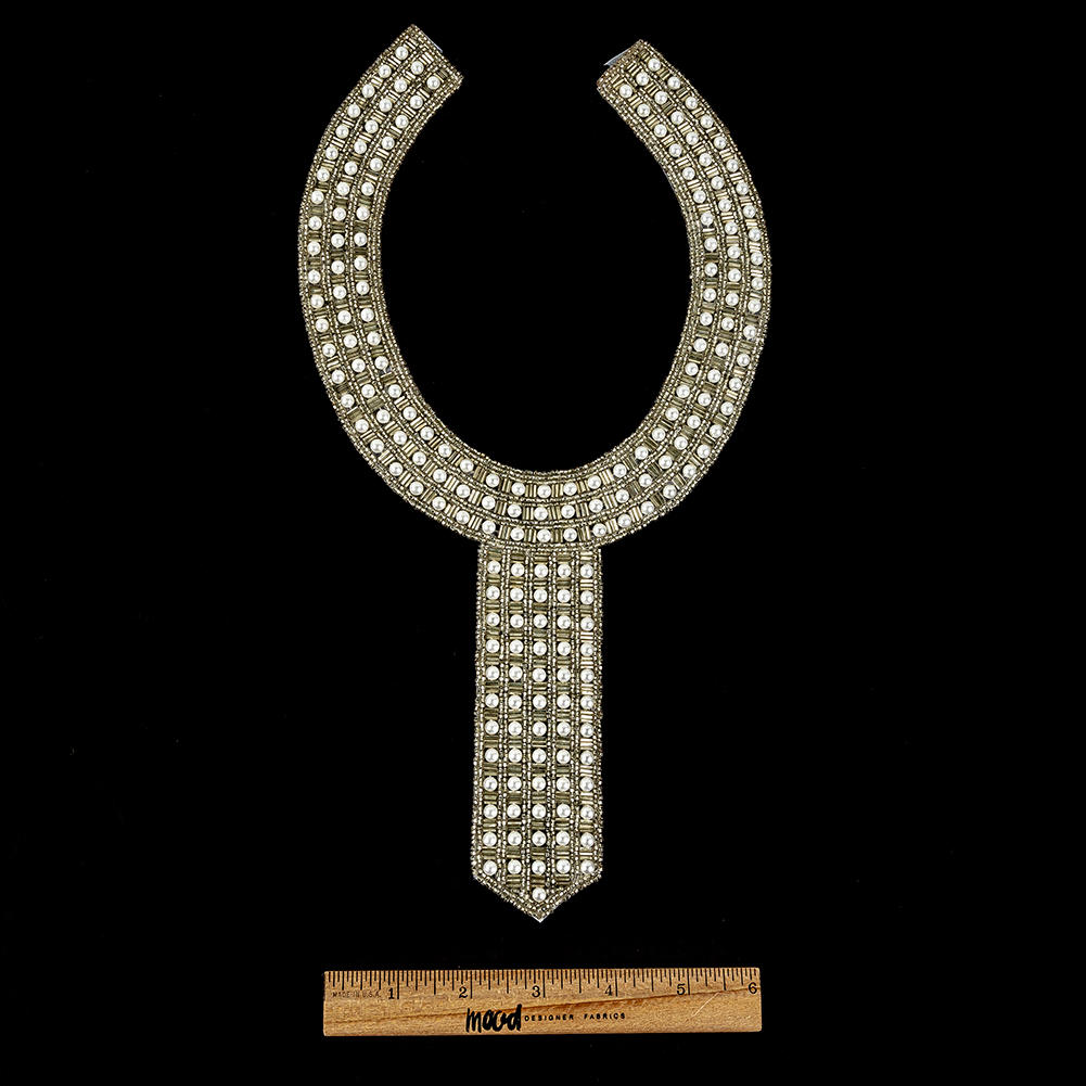 Looking for the pearl-fect finish for your next project? Check out this Vintage Fancy Pearl and Silver-lined Beaded Neckline Appliqué! Round pearl-finished beads recline within a grid of silver lined bugle beads and a glimmering seed bead outline in the same color, creating a rounded collar-shaped piece with a descending tie shape and an overall Ancient Egyptian aesthetic.