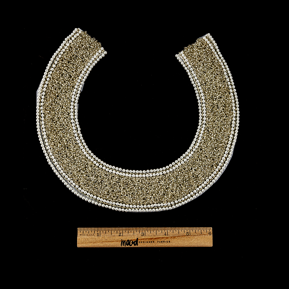This Vintage Fancy Pearl Bordered Silver-lined Beaded Neckline Appliqué is the perfect silver lining to any design! A round collar features a border of pearl-finished round beads and silver lined bugle beads around a densely packed, confetti-like amalgamation of silver-lined seed beads, reminiscent of a geode's center.Measuring 8.75 inches by 9.375 inches overall when laid flat, the collar piece has a width of approximately 2 inches and a gauge of 4.86mm. However, due to the nature of their construction, dimensions may vary slightly from piece to piece.With a heavyweight and undeniable opulence, add this appliqué to the necklines of high-collared blouses, create halter-neck dresses and gowns, or just add a closure for a fantastic necklace.