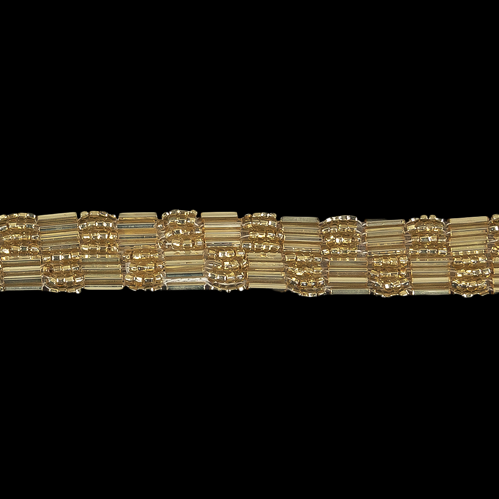Go for gold with Mood’s Vintage Gold 2 Row Seed and Bugle Bead Checkerboard Trimming! Here, alternating bugle and seed beads form a sparkling gold checkerboard.