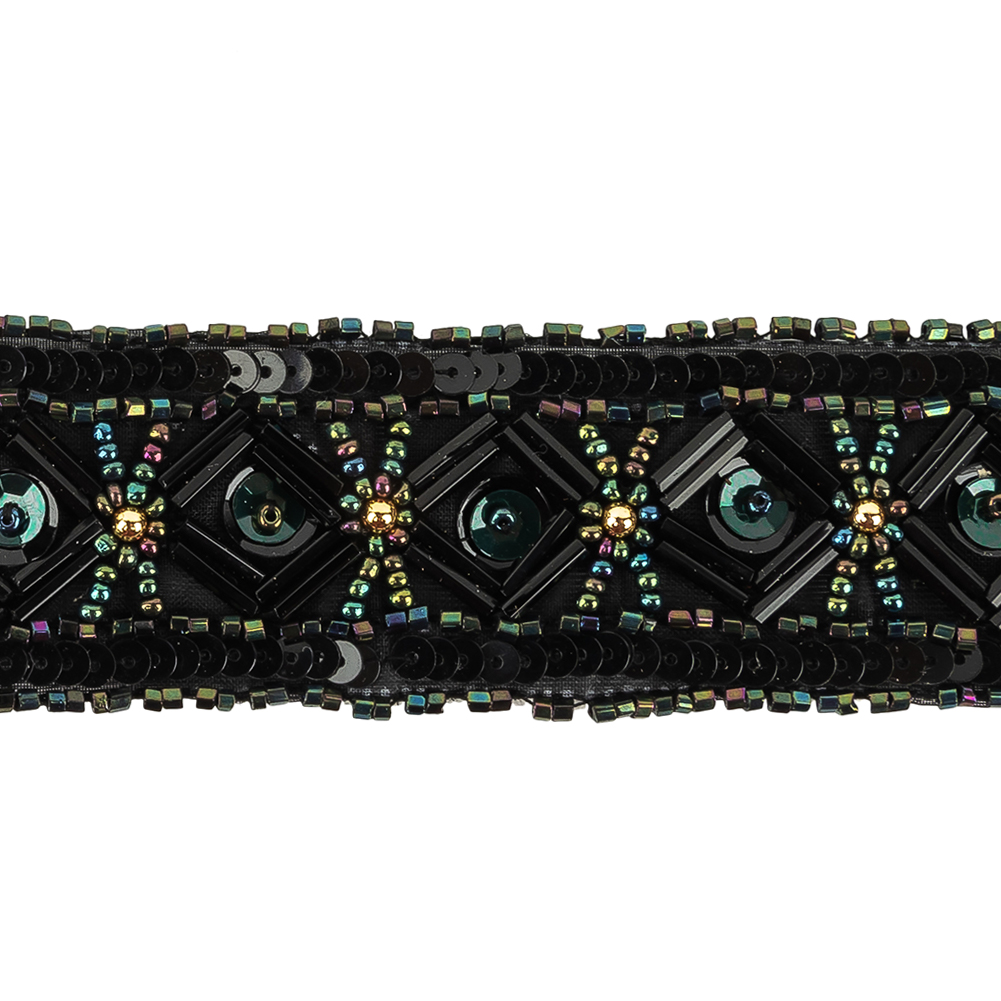 You could stare longingly at a symbolic green light across the water… or you could just embellish your next design with this brilliant Vintage Green Iris Geometric Beaded and Sequins Trimming! A ribbon-like confection, this trim features a geometric design that centers round gold beads and deep green sequins, with accents of darkly iridescent chop beads, black bugle beads, and black sequins for an altogether art deco look. Trim the hems or dropped waistlines of '20s-style dresses, dress up skirt hems and sleeves, or accent any number of accessories.This trim measures just over 1.25 inches wide and has a gauge of 3.53mm.