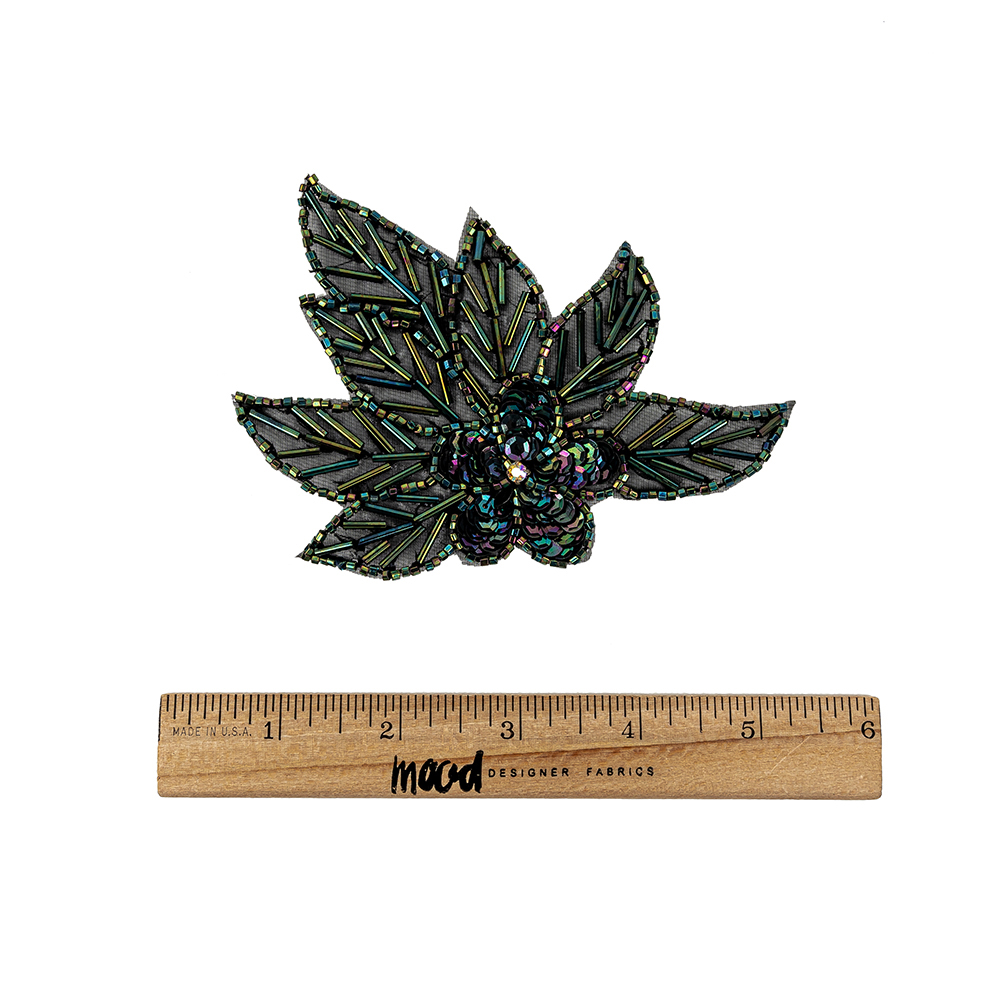 The dark iridescence of this Vintage Green Iris Sequins and Multi-lined Bugle Beaded Floral Appliqué with Rhinestone Center can add drama to any project! Floral, leafy, and wintery, this would be a fitting addition for a holiday dress, or swiftly create symmetry and use on both sides of a jacket or blazer.Backed by mesh, with a stiff construction, this accessory has a gauge of 2.3 mm, also measuring 4" in length by 4.375" in width.Please note: Due to the nature of its construction, the dimensions may vary slightly from piece to piece.