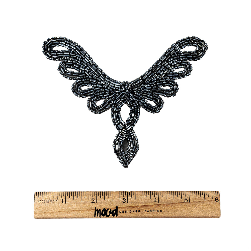 Test your metal with this Vintage Gunmetal Bugle and Chop Beaded Abstract Appliqué! Dark metallic steel-gray beads form a looped abstract design, reminiscent of a dragonfly or bird in flight.
